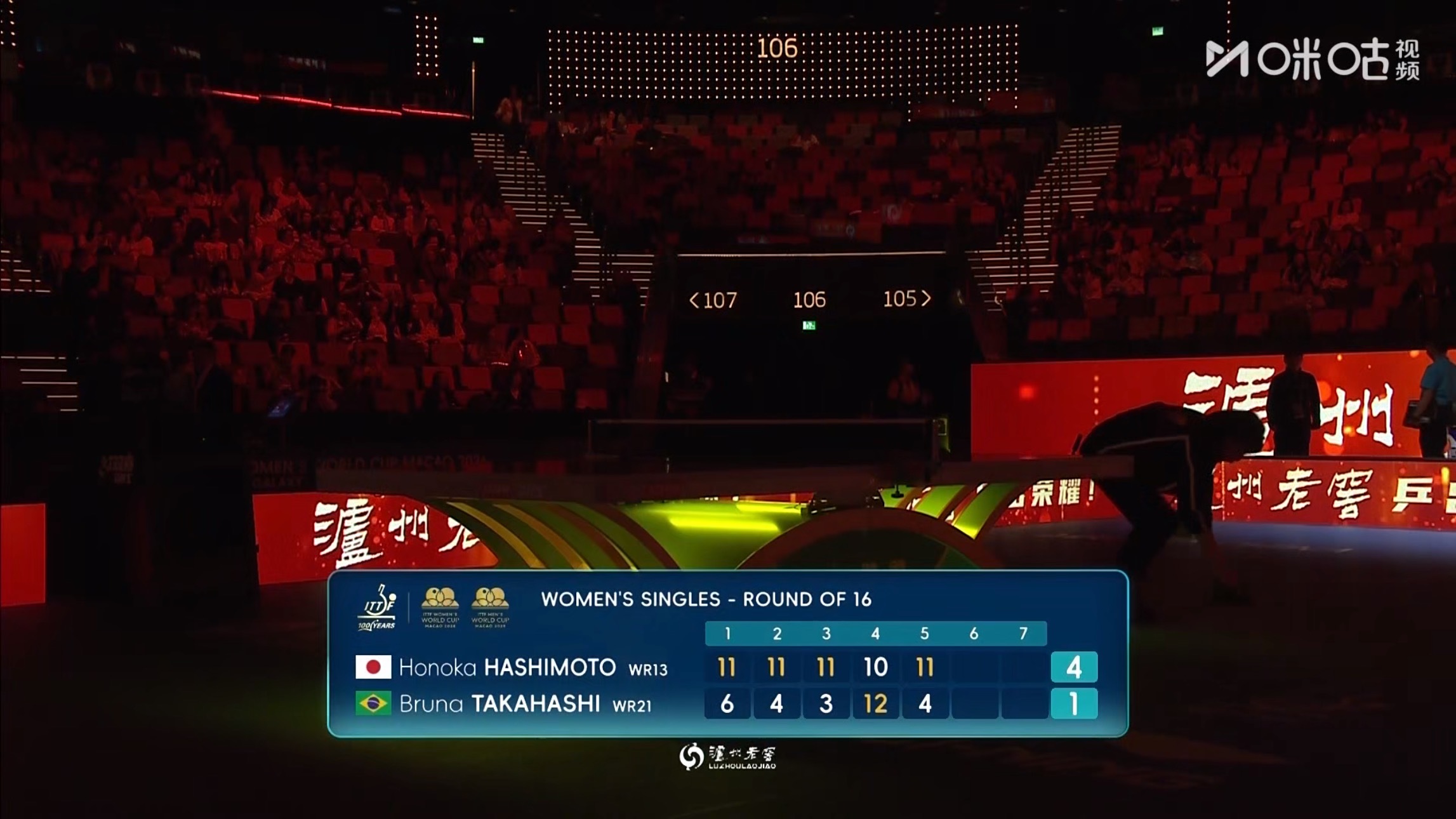 桥本帆乃香4比1高桥布鲁娜 乒乓球 (11-6,11-4,11-3,10-12,11-4)晋级澳门世界杯2026 女单8强