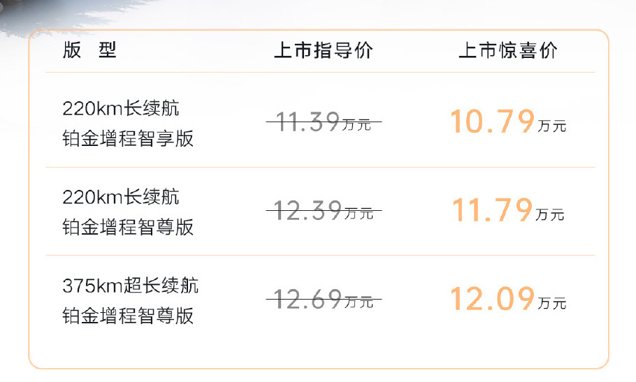 顶配车型「375km 超长续航铂金增程智尊版」,主要是纯电续航大幅提升至375公里,但价格只多了3000元,因为配置没有前面的中配高,主要原因还是为了控制价格,但电池价格就摆在这里了,就只能“简配”包括双区空调、主驾通风、副驾加热、前排按摩、副驾女王座椅等配置,可以“加钱选装”。