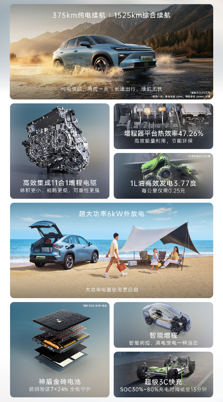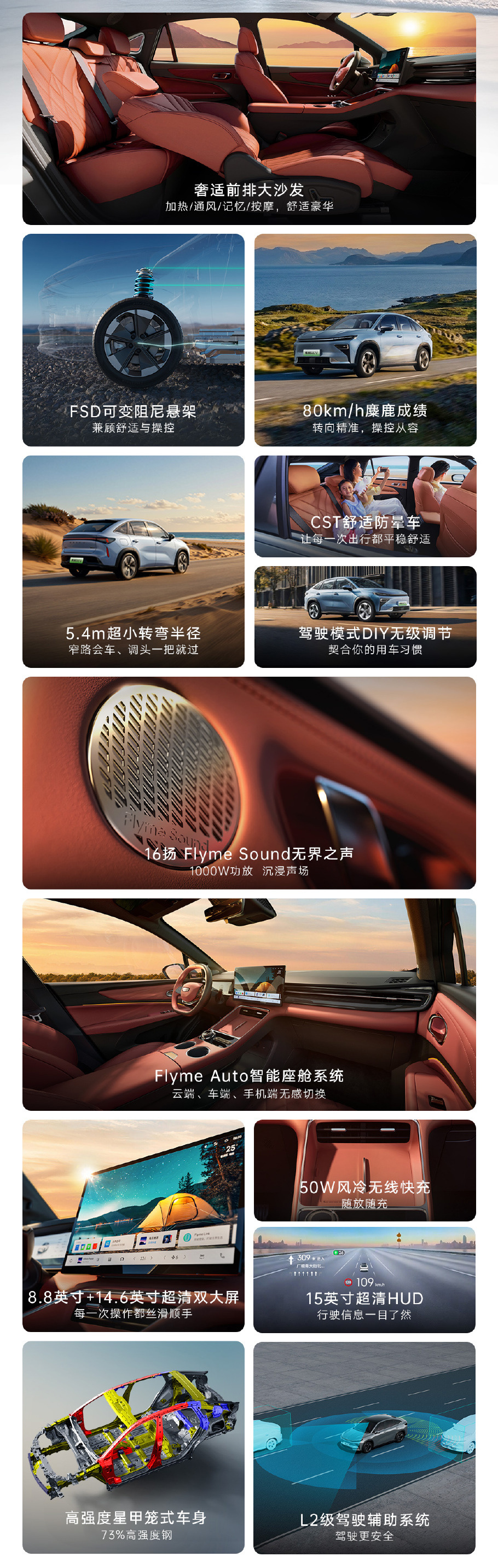今天 博越REV 上市,属于增程式紧凑型轿跑SUV,从这个售价来说,自然就是400V架构、前置电机、前麦弗逊/后扭力梁的配置,没什么可说的,减振器倒是给了FSD可变阻尼,而且是标配。标配1.5L增程器,电机功率160千瓦,220公里版为28.3kWh电池(百公里馈电油耗4.95升)、375公里为50.4kWh电池(百公里馈电油耗5.15升)。