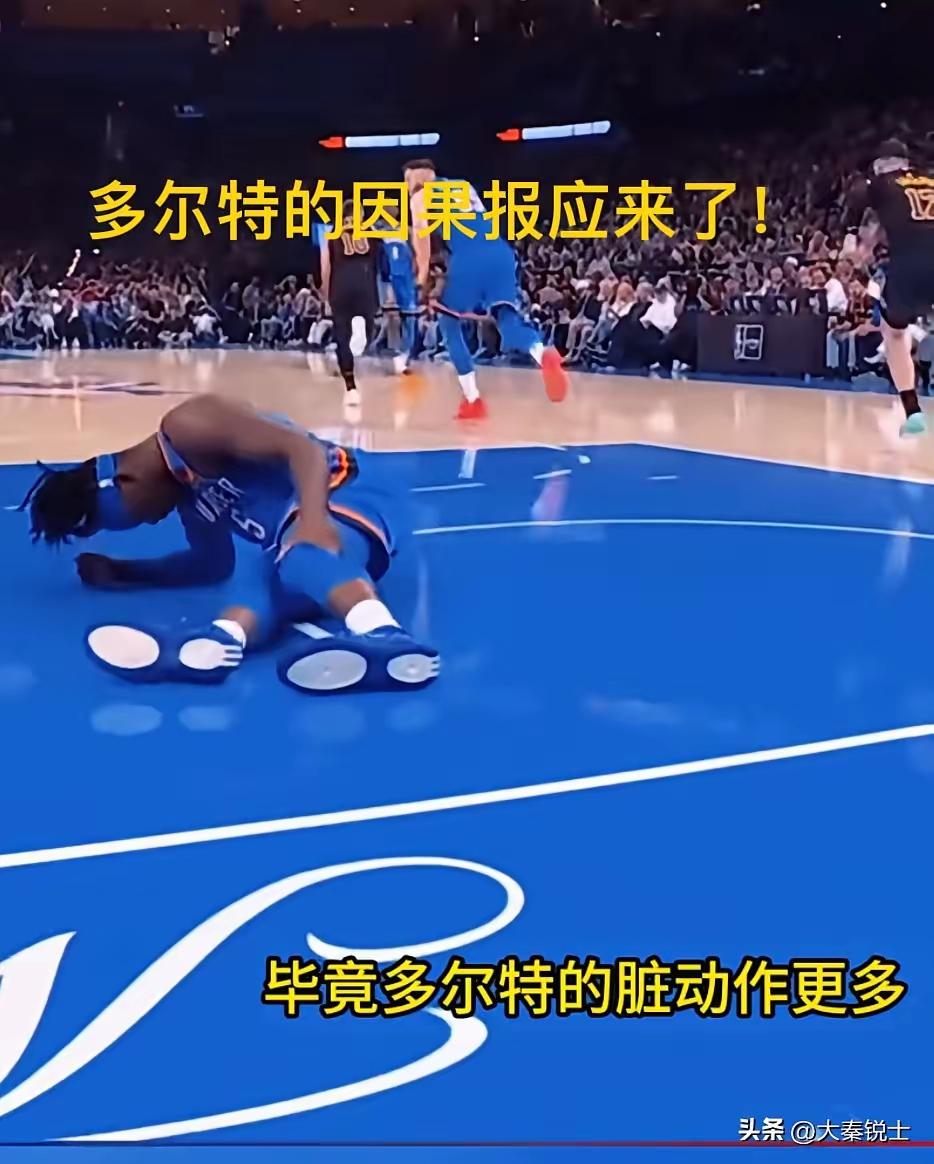 天道好轮回!雷霆对阵湖人一战,多尔特突破上篮被拉拉维亚封盖,身体失衡重重摔在地板上,倒地后半天起不来,表情痛苦,最终和东契奇一样返回更衣室检查。