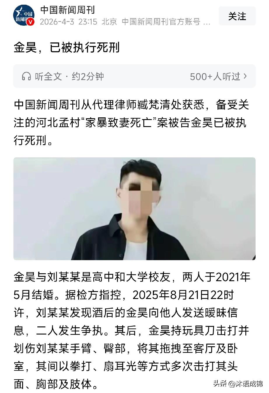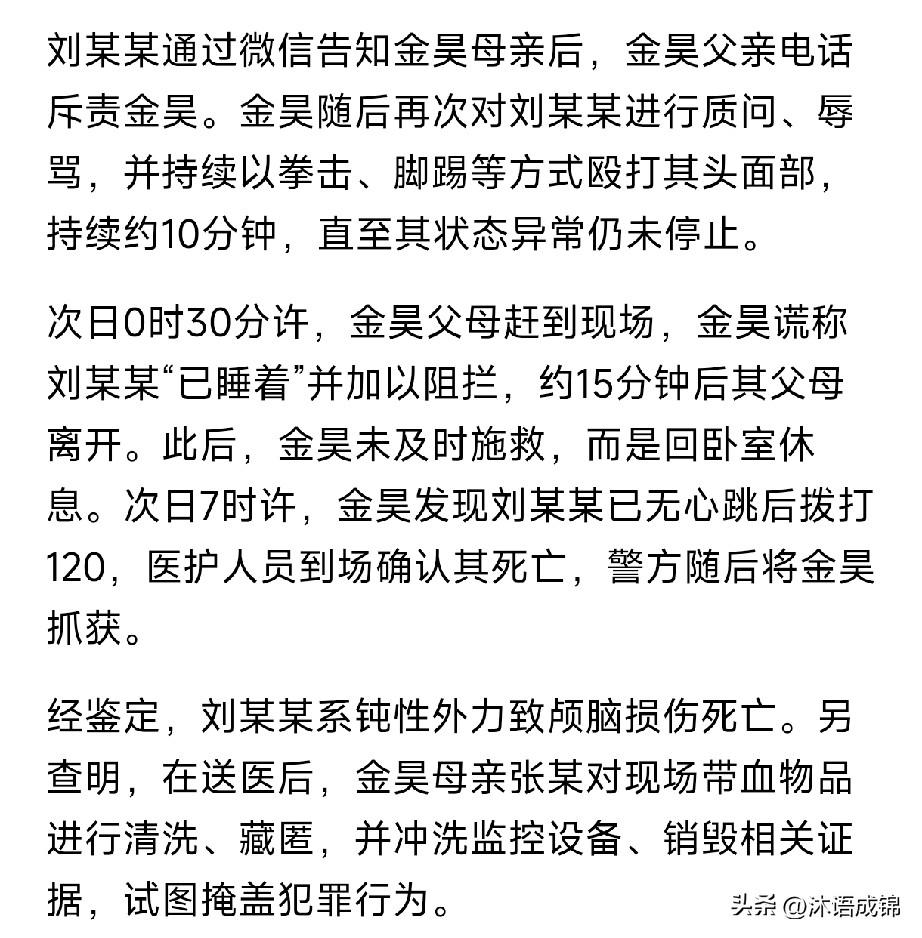 一念之差! 河北孟村被家暴致死的刘某某,生前错把信息发给金昊的母亲,间接导致了她的死亡!金昊已经被执行死刑,漂亮温婉的刘某某却再也回不来了! 刘某某属于下嫁!她从小就是家里的掌上明珠,爸爸妈妈爱若珍宝,爷爷奶奶视如心肝,姑姑也对这个侄女倍加宠爱。 就是这样一个被娘家人捧在手心里长大的女孩,在婚姻里却被弃如敝屣,被丈夫金昊徒手打 死,这是多么的意难平! 刘某某、金昊二人是初中同学、高中同学,刘某某学习努力成绩优秀,金昊吊儿郎当不是学习的料。以刘某某的成绩,本来可以上一个更好的大学,但为了和金昊在一起,她自作主张去了一个差学校。 2021年5月,金昊迎娶刘某某,刘家父母陪嫁20多万,为的就是女儿能在金家有底气。 强扭的瓜不甜,硬嫁的女人不会被珍惜。从他们结婚当天的视频来看,新娘子刘某某一脸幸福,她想告诉全世界,她的新郎是多么帅气又多么爱她! 反观金昊,一副淡然无所谓的模样,丝毫看不出他该有的幸福与兴奋。 婚后的刘某某安心持家,洗手作羹汤,勤劳节俭,尽心照顾老公和儿子,这样的付出被金昊看成理所当然,处处不把妻子放在眼里,甚至搞起了婚外暧昧。 2025年8月21日晚上10点多,刘某某发现酒后的金昊向她人发送暧昧信息,一开始刘某某好心劝金昊为了儿子不要这样,金昊却感觉妻子是多管闲事故意挑衅。 一会儿两人争执升级,金昊用玩具刀伤害刘某某,刘某某趁金昊打累了休息的片刻,偷偷发信息给金昊的母亲张某。随后,金昊的父亲给金昊打电话斥责儿子。 金昊恼羞成怒,一向对他言听计从的妻子居然会告状。他怒不可遏,再次对刘某某进行质问、辱骂、击打其头面部。10分钟后,刘某某已经是不省人事的状态,但金昊并没有停止他的暴力。 次日0时30分左右,金昊的父母赶到儿子儿媳的住处查看情况,金昊告诉刘某某已经睡了,不让父母进卧室看刘某某。15分钟后,金昊的父母感觉小夫妻吵架拌嘴很正常,没什么大事,就离开了。 父母走后,金昊没有进一步查看妻子的情况就直接上床睡觉了!早晨7点,金昊才恍然发现刘某某没了心跳,拨打120后,医护人员到场确认刘某某已经死亡。 就这样,一朵正在璀然绽放的花朵在暴力下凋零! 试想一下,如果刘某某被丈夫打后,不是给婆婆发信息,而是给自己的爸爸妈妈或者姑姑、弟弟发信息,情况是不是就完全不一样了。 娘家人如果知道宝贝女儿被打了,肯定会马上打电话给女婿警告他住手,此时金昊肯定会忌惮于妻子娘家人的力量不敢继续殴打。娘家人还会马不停蹄的赶去看看女儿有没有受伤,暴脾气的娘家人甚至会去打女婿一顿。 金昊的父母不紧不慢的感到儿子儿媳的住处,儿子不让看儿媳,婆婆公公就真的相信了儿子的话,待了十几分钟就走了。 如果是娘家人到了,女婿说妻子已经睡了不让看,娘家人会相信吗?会放弃吗?娘家人无论如何也会看到女儿没事才会放心离开。 刘某某为什么不给爸爸妈妈发信息,而是给婆婆发信息呢?归根结底还是虚荣心和孝心害了她! 当初爸爸妈妈不让刘某某嫁给金昊,刘某某一意孤行执意要嫁,婚后的苦她无处可诉。一是为自己的不听父母言买单,二是不想让父母过于担心自己。 打人致死的金昊已经被执行死刑,他最终为自己的罪恶付出了应有的代价。 刘某某发信息给婆婆,婆婆轻信了儿子的话,导致事情发展到了不可挽回的局面。 刘某某的事告诉每一个待嫁的年轻女孩,结婚前一定要擦亮眼睛,不要凭某个有某个优点而忽视了他的其它缺点。父母的意见一定要认真考虑,不要意气用事。婚后一旦发现丈夫有家暴倾向不要忍,不要独自扛,更不要怕家丑外扬。把暴力和不公晒在阳光下,才能毁灭于萌芽状态。
