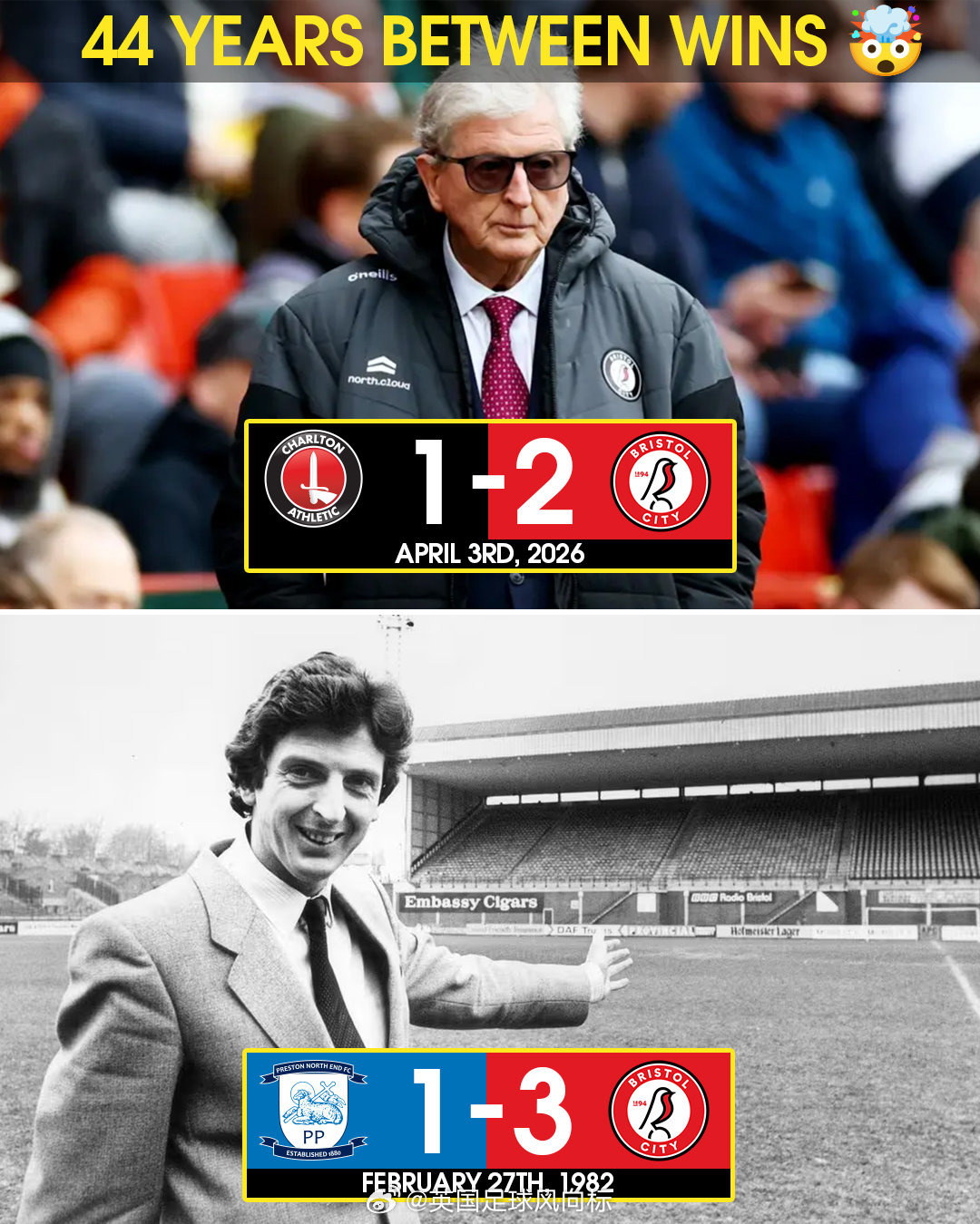 【霍太公创下神奇纪录】英冠联赛复活节快车,78岁传奇老帅霍奇森,重出江湖后的首场比赛,带领布里斯托城作客2比1击败查尔顿。1982年2月27日-2026年4月3日,这距离他上一次执教布城拿到比赛胜利,已经过去了整整44年时间。