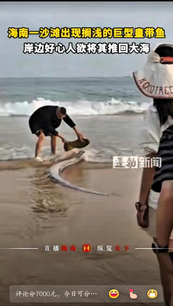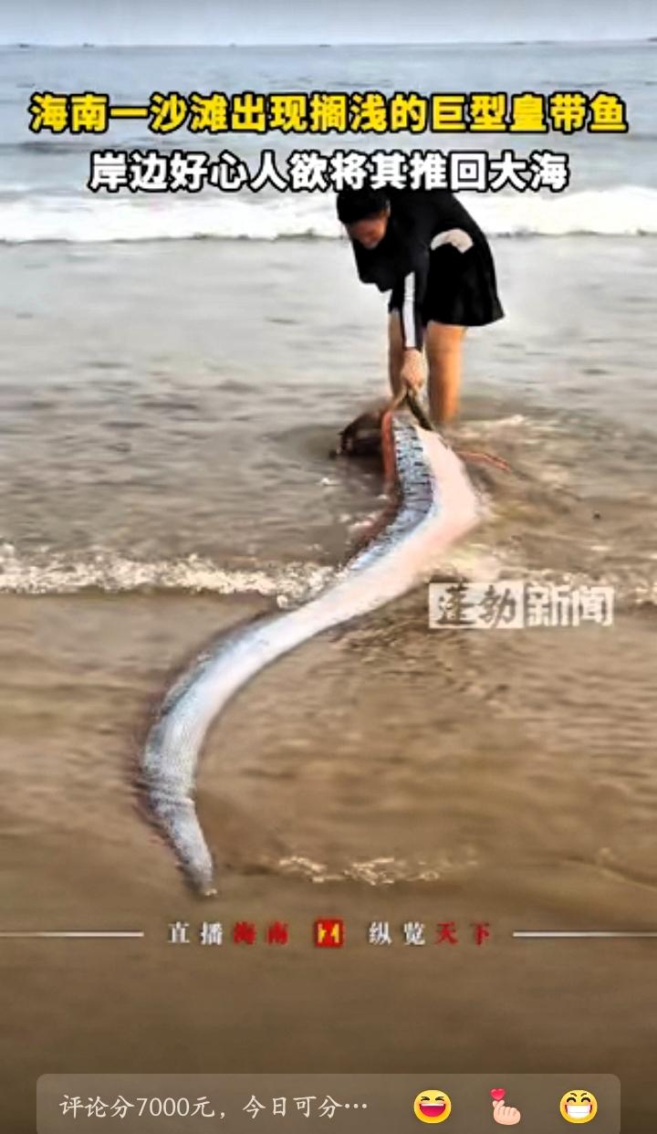 太罕见了,海南,一女子在海边游玩时,突然发现有个东西被海水冲了上来,上前一看竟然是一条巨型皇带鱼,
