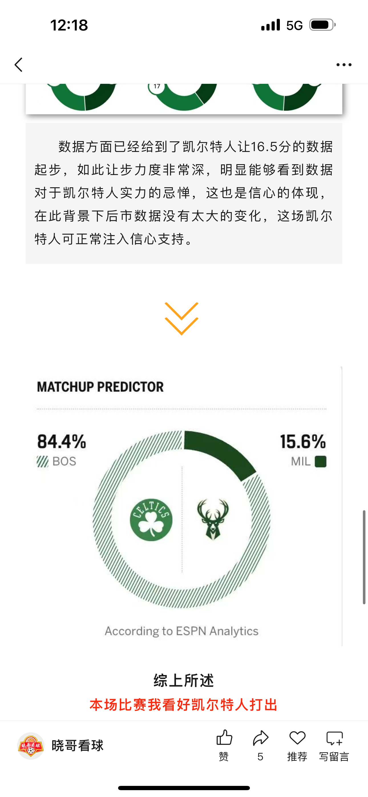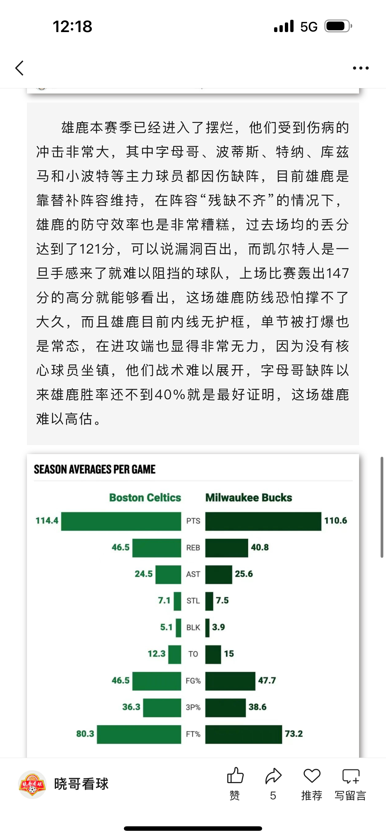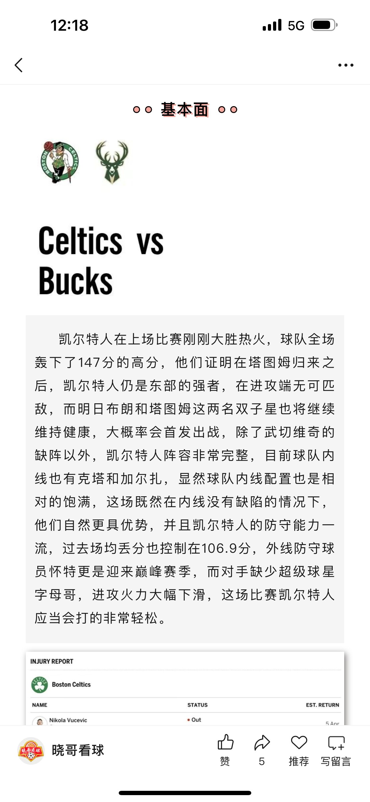 昨日公推篮球NBA凯尔特人方向获得好评,这场我所阐述的观点也是非常的清晰,我说过凯尔特人在本场比赛中的攻击力是“残阵”雄鹿所无法抵挡的,这场首节凯尔特人就轰下了43分,早早建立了优势,而缺少了字母哥这名大核心的情况下,雄鹿追分实在困难,在凯尔特人的严防死守下,库兹马也只贡献了14分,这是一场实力鸿沟差距的对决,因此凯尔特人好评合理。篮球预测体彩凯尔特人雄鹿