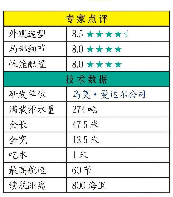 “盾牌”级导弹快艇的航行速度可以达到惊人的60节,而且吃水仅1米,不但适合沿岸作业,还能避过一些大型水雷。
