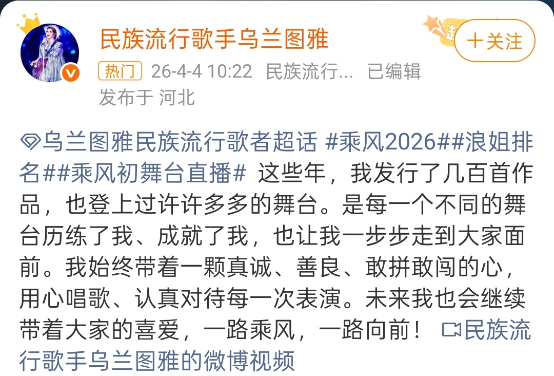 乌兰图雅回应浪姐初舞台像商演 “在我的心中,舞台是不分大小的。”每个舞台都造就了现在的乌兰图雅,游刃有余热情满满,认真对待每一次表演!乘风热度乘风2026