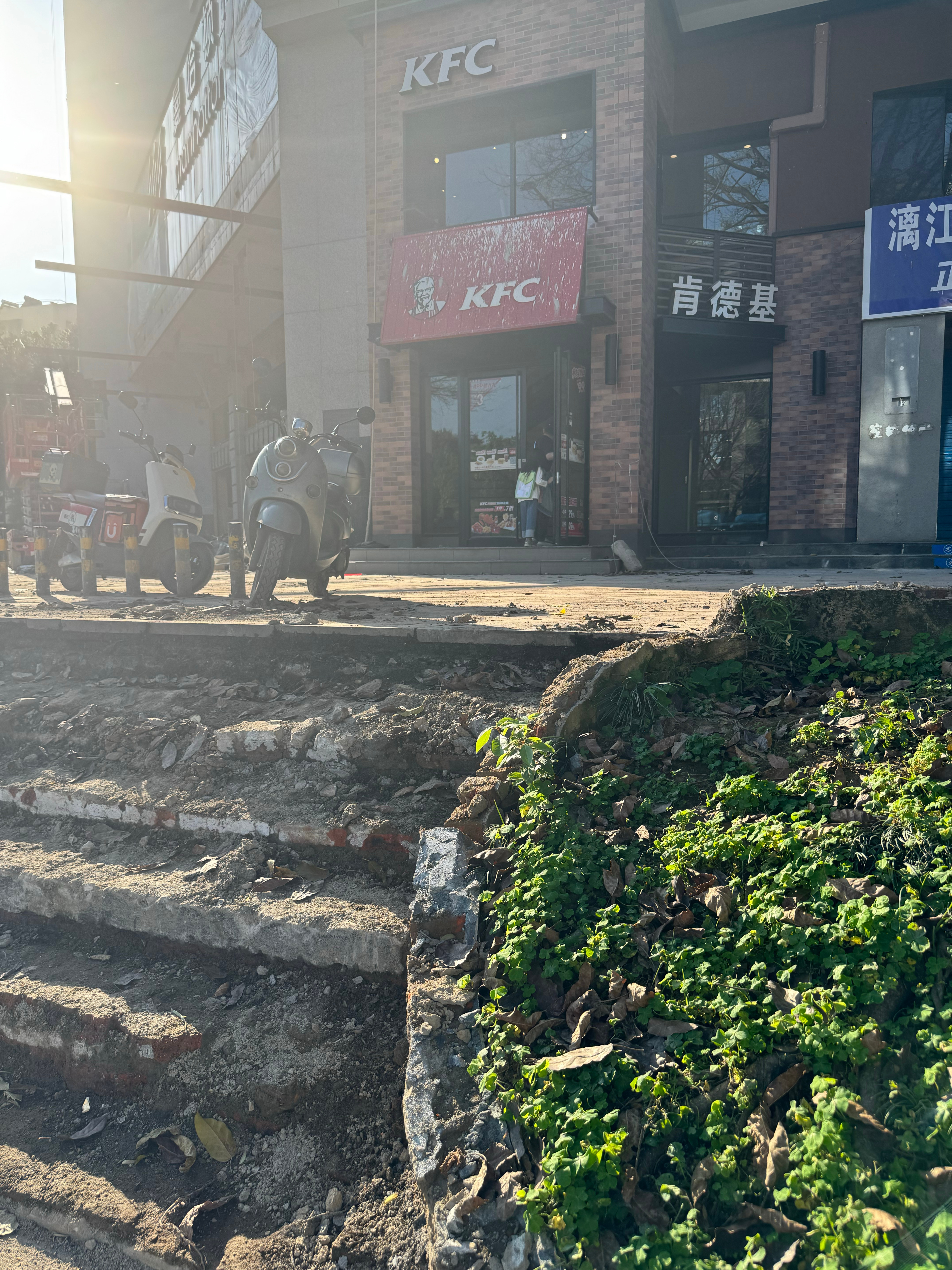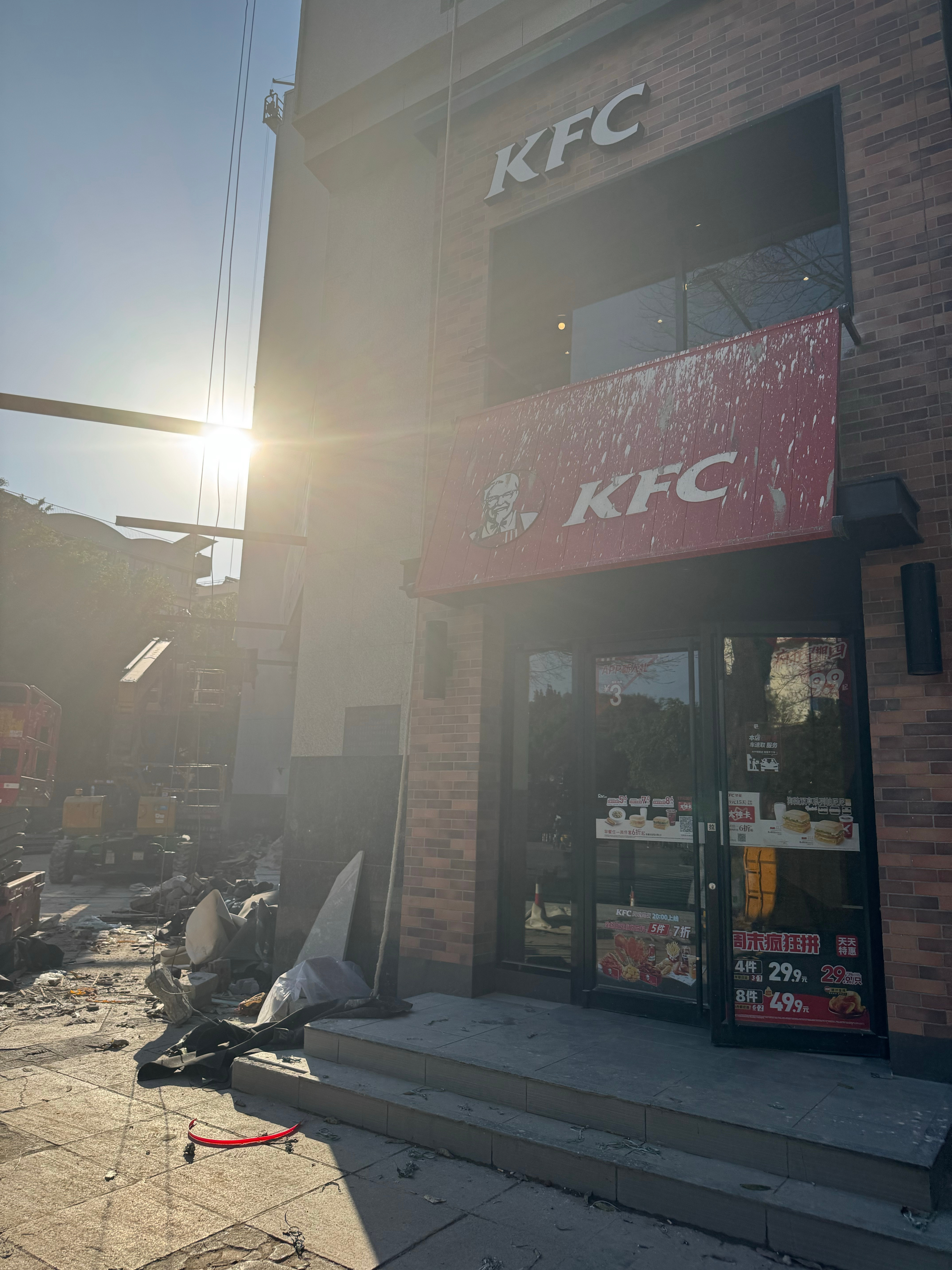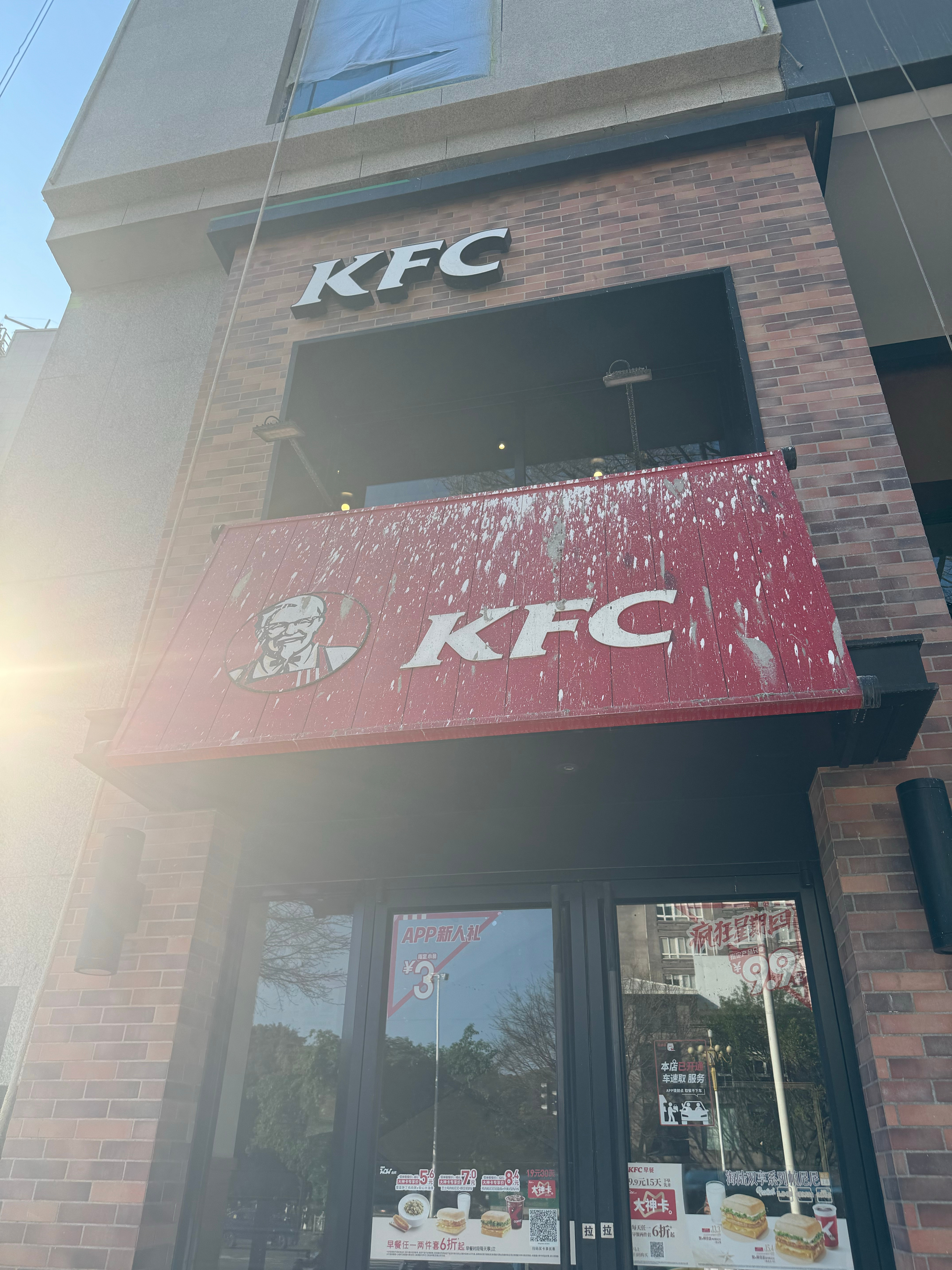 第二家店是如图所示这样战损版的看外面以为关了呢上来发现还开着我们是今天第 100 位顾客这个点了才是 100 位在肯德基这里也不太常见吧