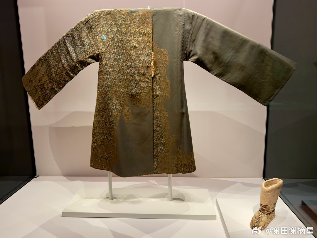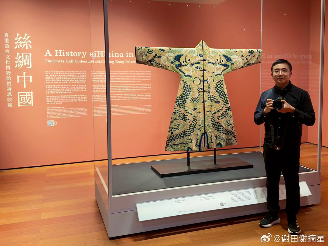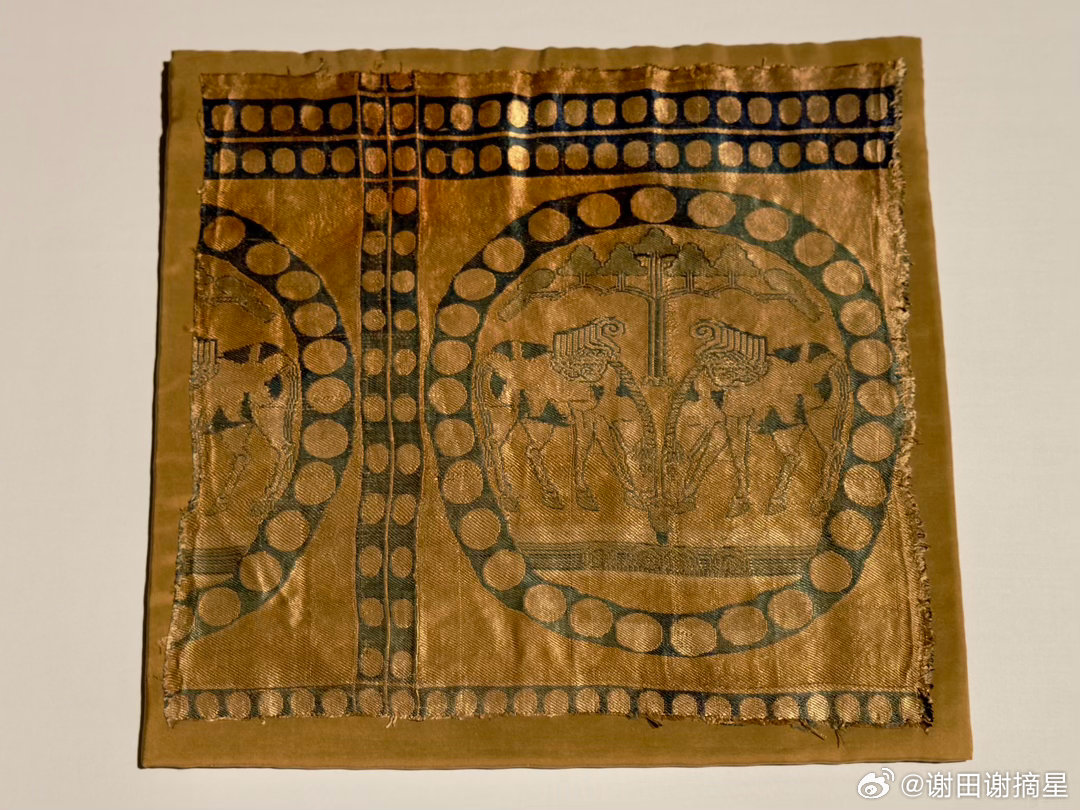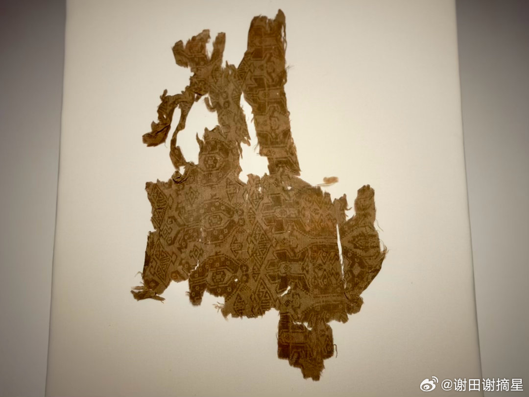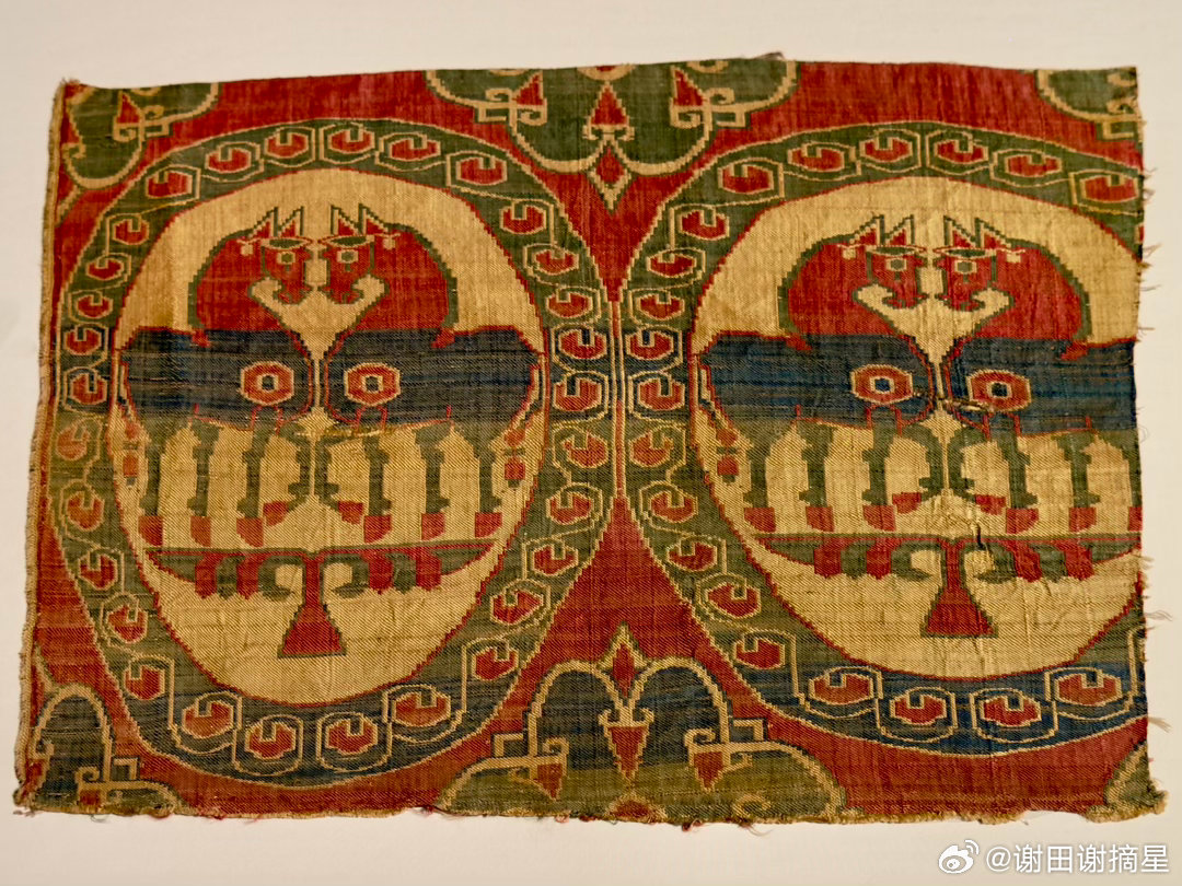 主打香港藏家贺祈思的旧藏精品。合影的是一件斗牛褂,料子是明代中期的,传入西藏后在清代做成了褂子,时间和地点的跨度让它成了一件名品。图2是战国织锦,现存最古老的织锦实物之一。