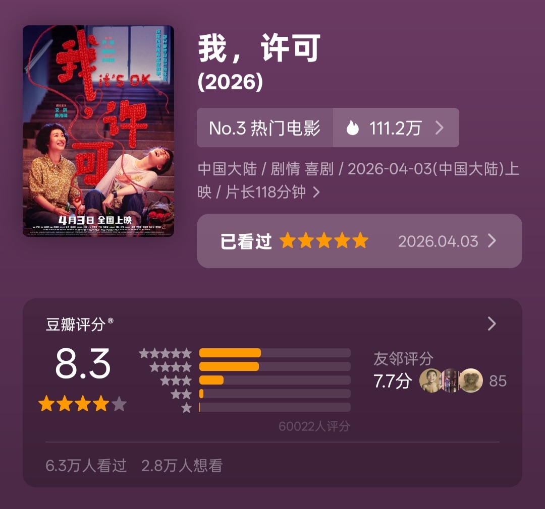 《我,许可》豆瓣开分8.3!!都不只是清明档最高分,而是今年目前院线华语新片最高