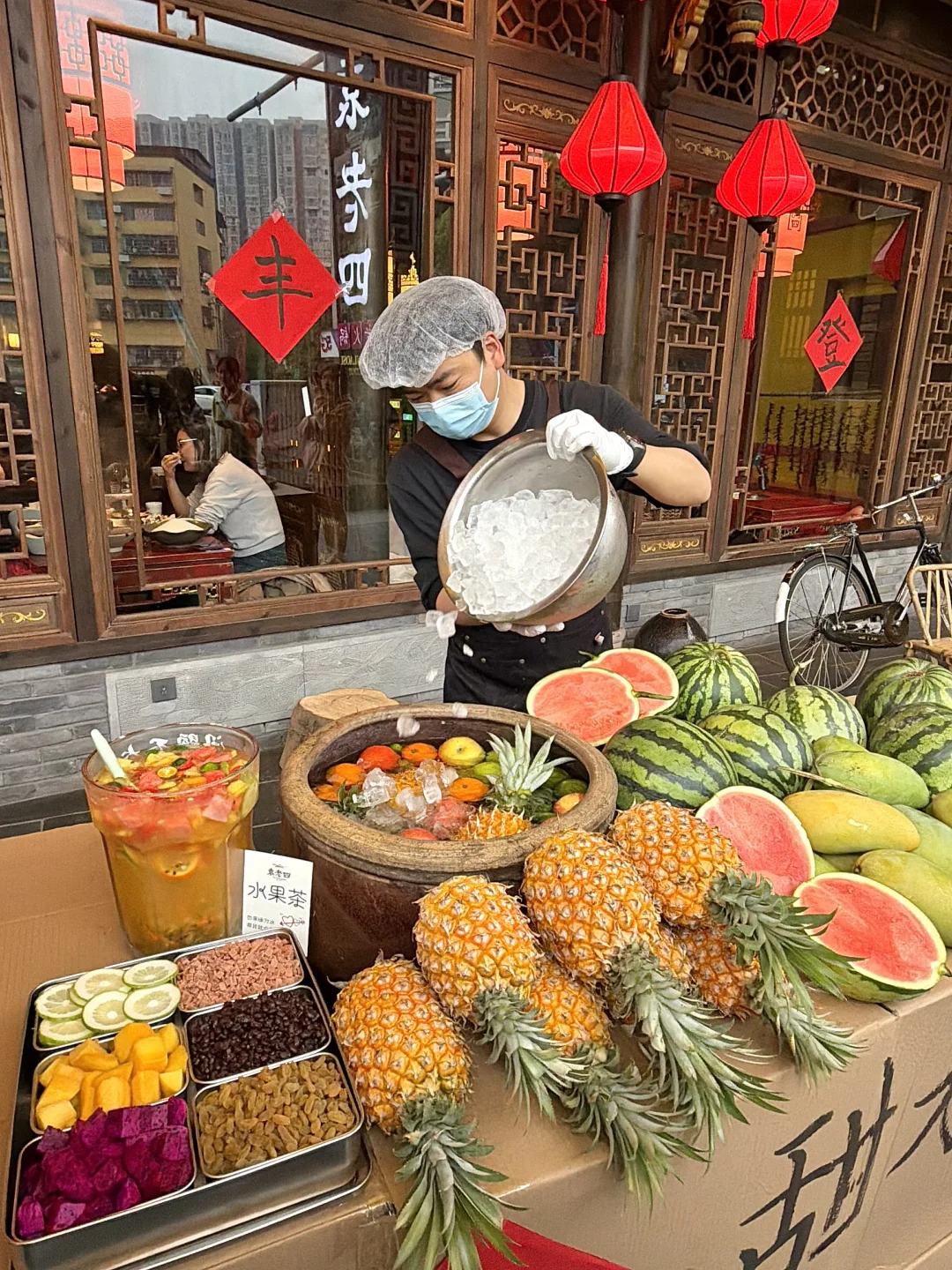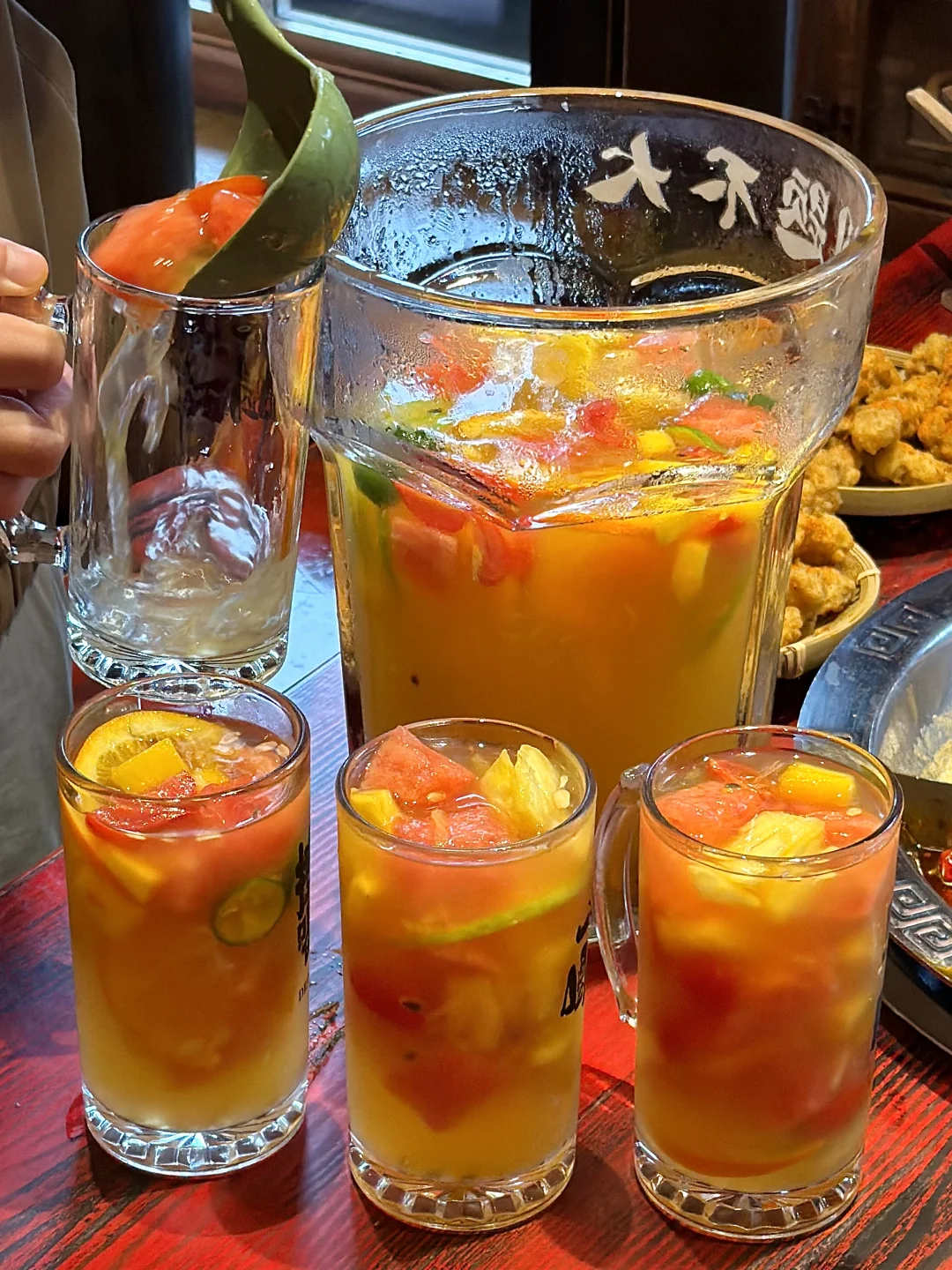 还有一大杯水果茶,冰冰凉我好爱🥹🥹和朋友们一起分享太适合了……袁老四火锅