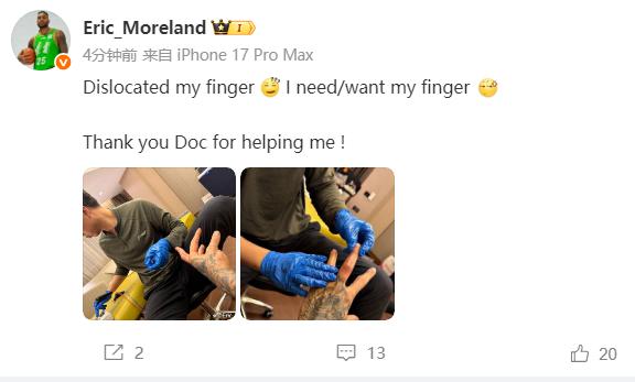 莫兰德刚刚发个微博写道:Dislocated my finger(手指脱臼了)