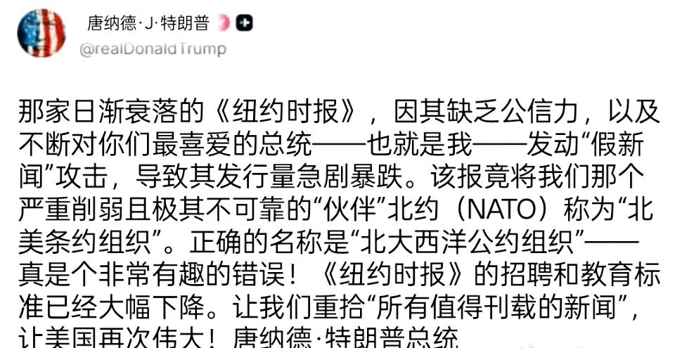 他又怼假新闻“纽约时报”将北约名字搞错