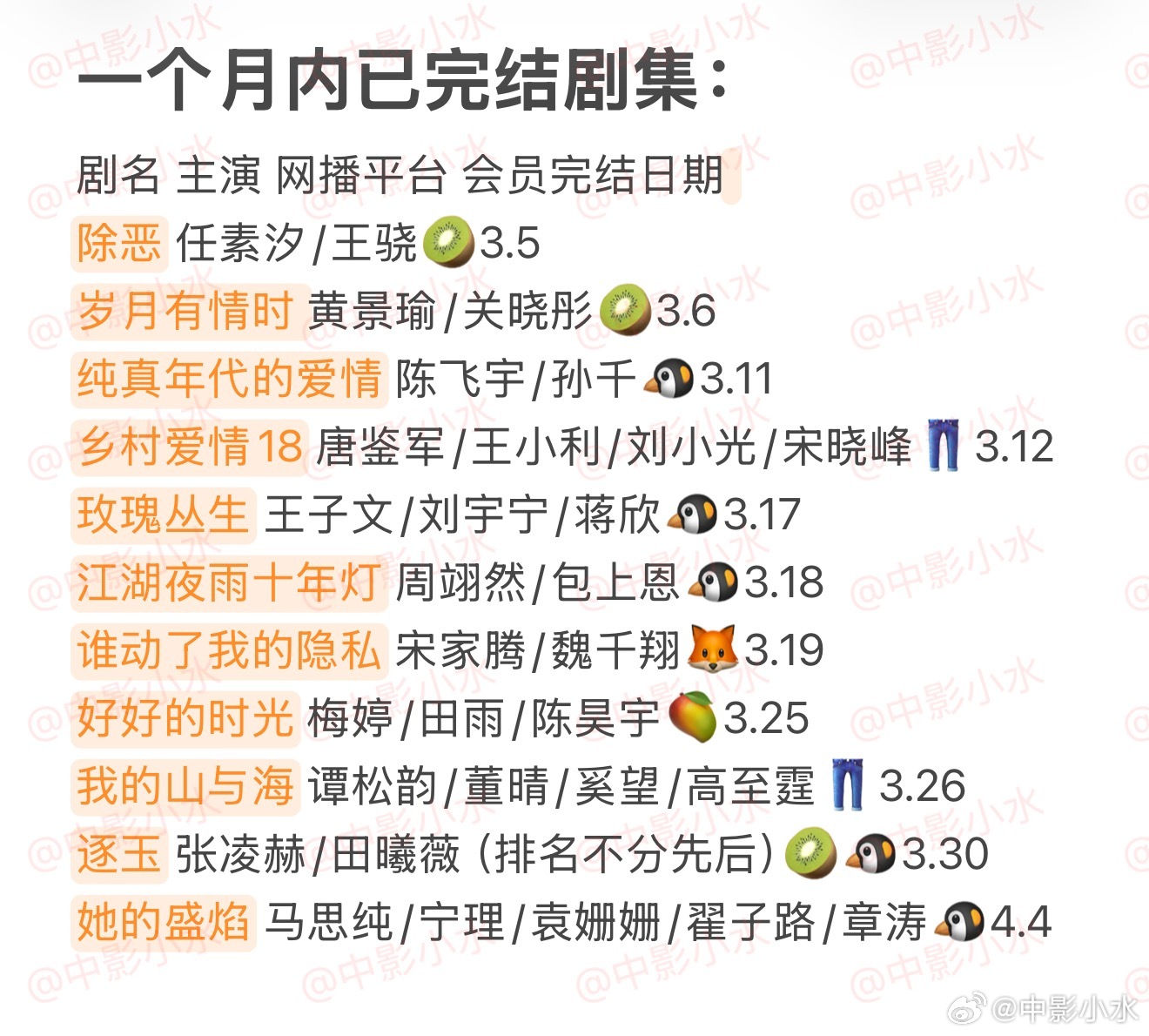 🈶她的盛焰 马思纯/宁理/袁姗姗/翟子路/章涛🈶白日提灯 迪丽热巴/陈飞宇🈶叵测 刘烨/聂远/王佳佳🈶月鳞绮纪 鞠婧祎/曾舜晞/陈都灵/田嘉瑞(排名不分先后)🈶钢铁森林 井柏然/蔡文静