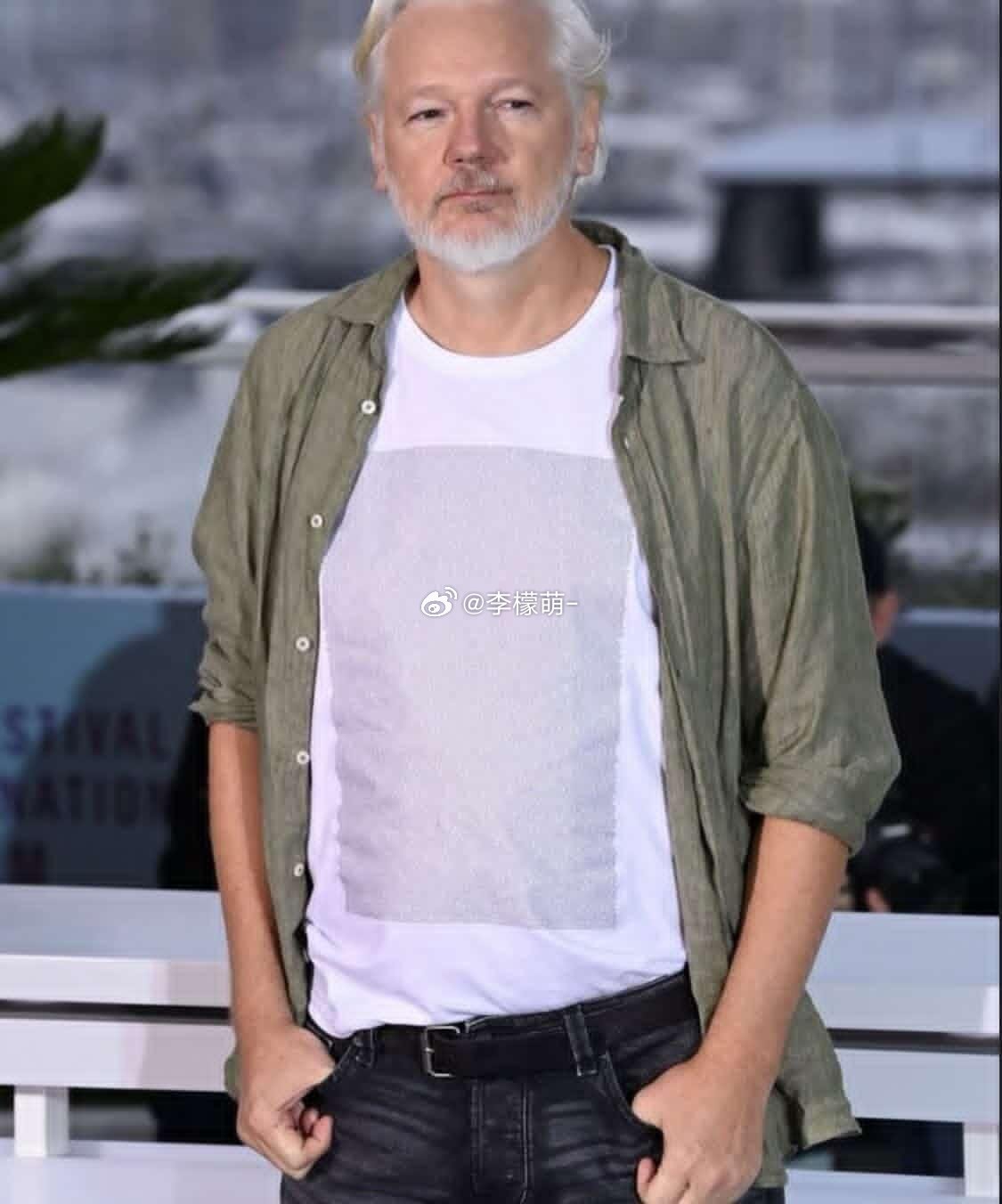 朱利安·阿桑奇在戛纳电影节上穿了一件T恤,上面印着 4986 名被以色列杀害的五
