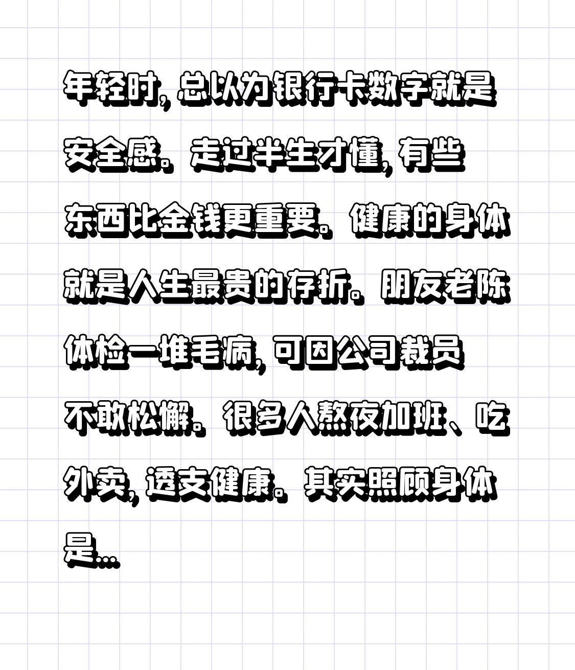 健康的身体就是人生最贵的存折。朋友老陈体检一堆毛病,可因公司裁员不敢松懈。很多人熬夜加班、吃外卖,透支健康。其实照顾身体是对自己基本的负责,每天散步二十分钟、在家做几顿清淡饭菜,健康是持久战。