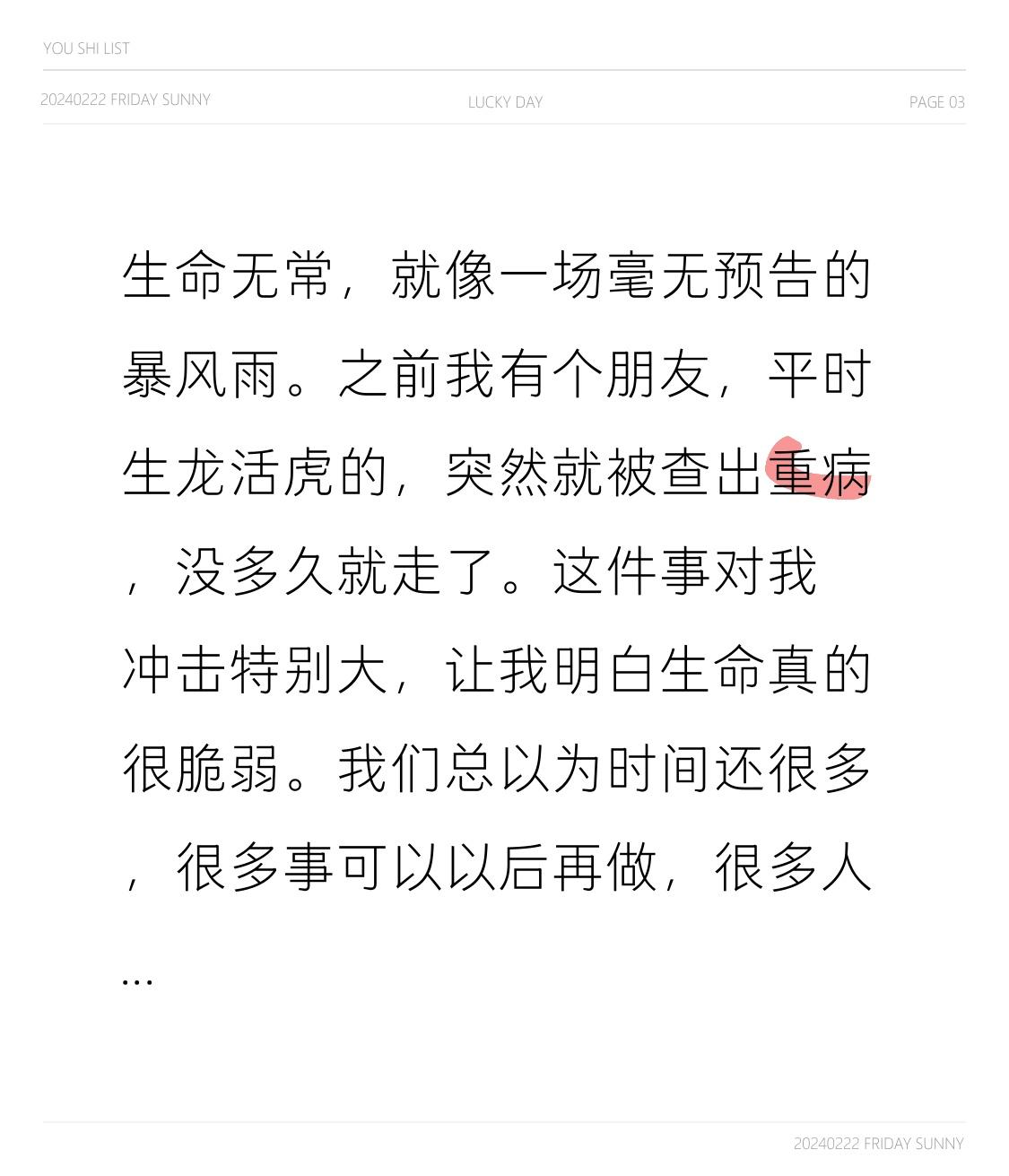 生命无常,就像一场毫无预告的暴风雨。之前我有个朋友,平时生龙活虎的,突然就被查出重病,没多久就走了。这件事对我冲击特别大,让我明白生命真的很脆弱。