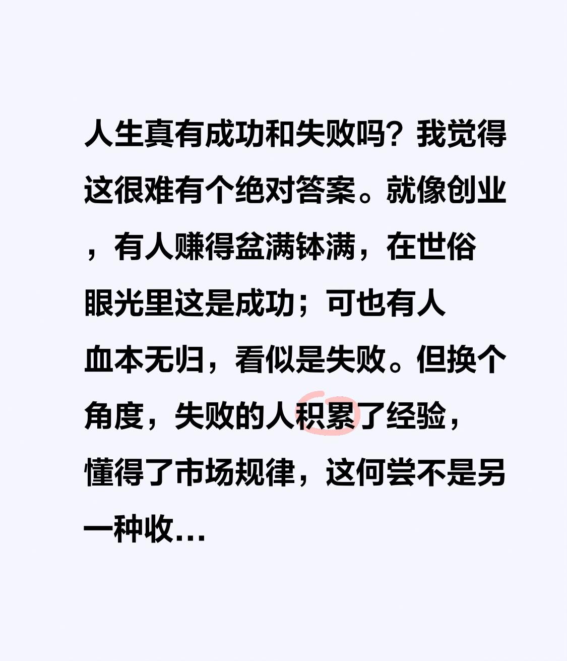 人生真有成功和失败吗?我觉得这很难有个绝对答案。就像创业,有人赚得盆满钵满,在世俗眼光里这是成功;可也有人血本无归,看似是失败。但换个角度,失败的人积累了经验,懂得了市场规律,这何尝不是另一种收获。再比如高考,考上名校仿佛成功在望,名落孙山好像就是失败。然而人生那么长,之后的路还得自己走。所以,成功和失败或许只是一时的标签,人生是一场漫长的体验,每段经历都有它的意义。