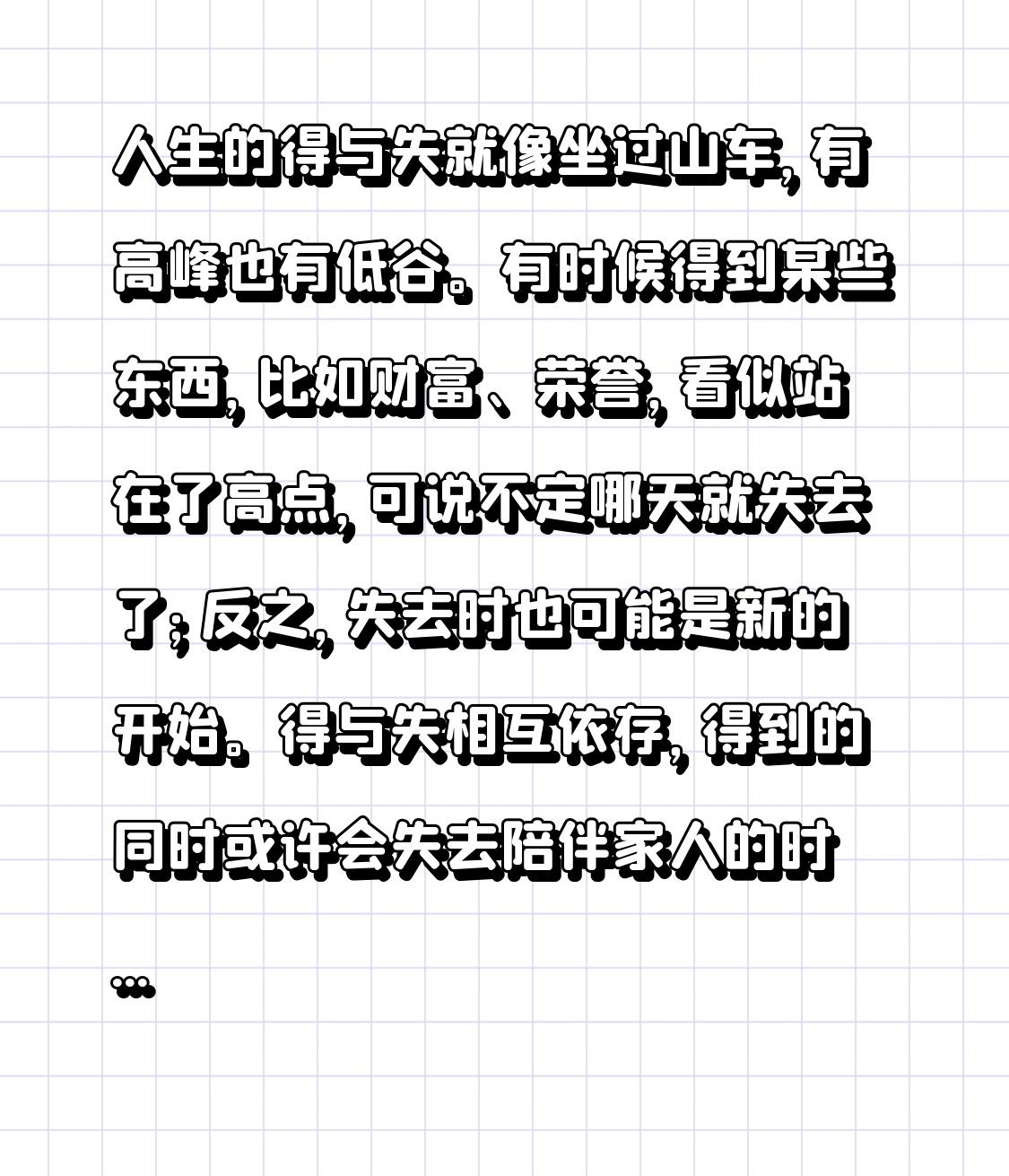 得与失相互依存,得到的同时或许会失去陪伴家人的时间,失败多了也许就能总结出成功的经验。成功别太骄傲,因为背后可能有失去的代价;失败也别灰心,这是走向成功的必经之路。