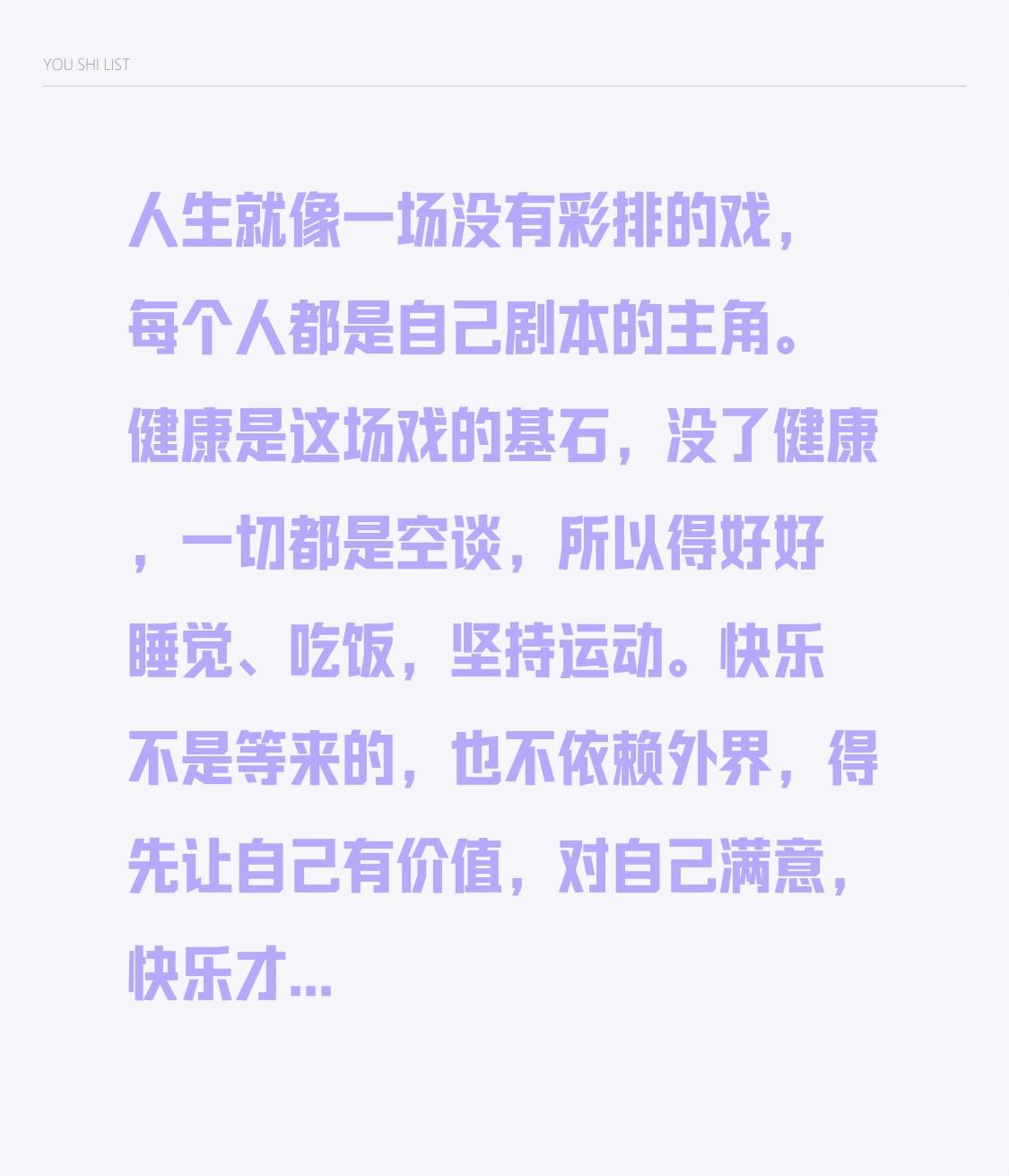 人生就像一场没有彩排的戏,每个人都是自己剧本的主角。健康是这场戏的基石,没了健康,一切都是空谈,所以得好好睡觉、吃饭,坚持运动。