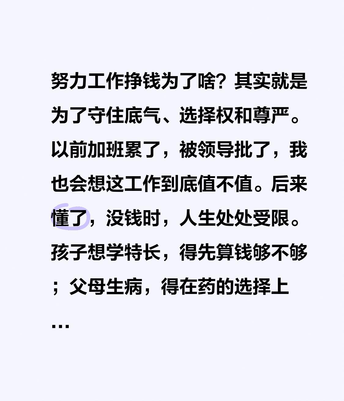 以前加班累了,被领导批了,我也会想这工作到底值不值。后来懂了,没钱时,人生处处受限。孩子想学特长,得先算钱够不够;父母生病,得在药的选择上纠结;工作受气也只能忍着。