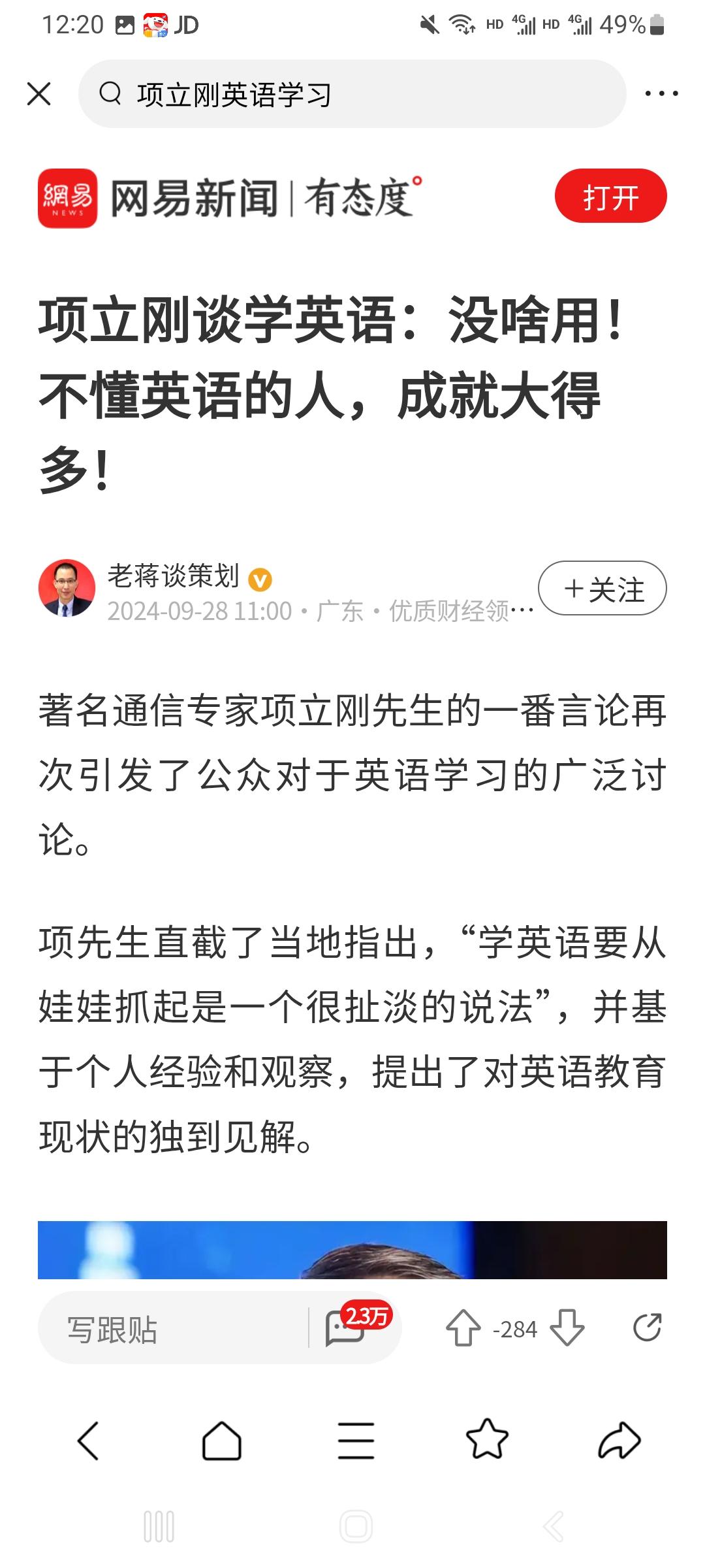 项立刚自己不懂英语,就眼红会英语的人。 项立刚把儿子送去美国,是带着翻译的。 项
