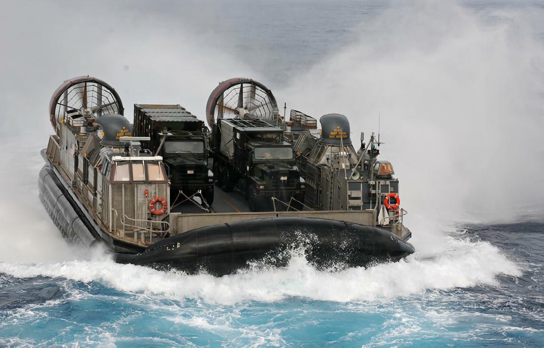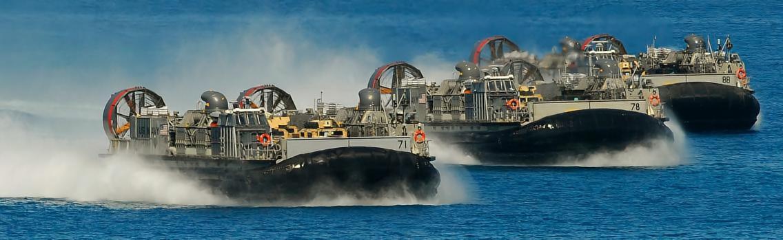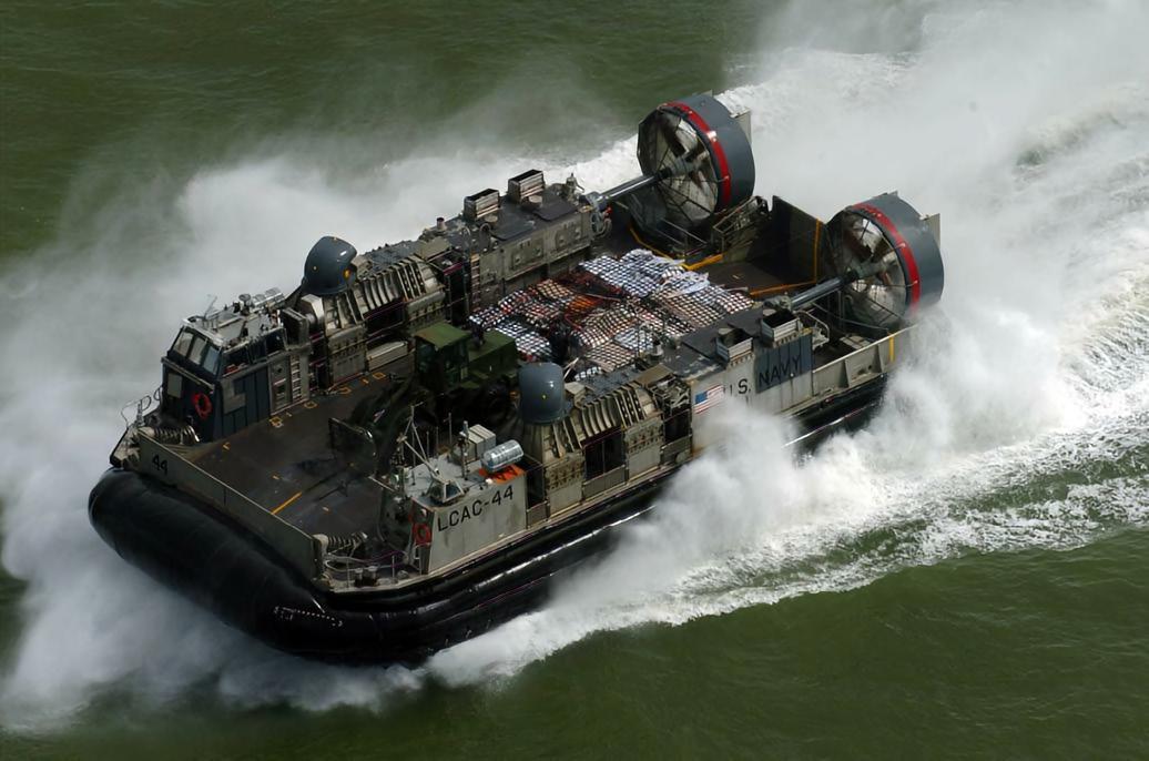 LCAC气垫登陆艇具有理想的快速性,良好的通过性和独特的两栖性,不受潮汐、水深、雷区、抗登陆障碍和近岸海底坡度的限制。