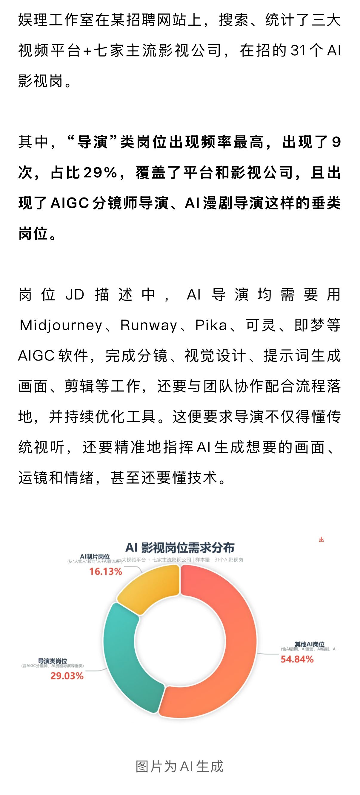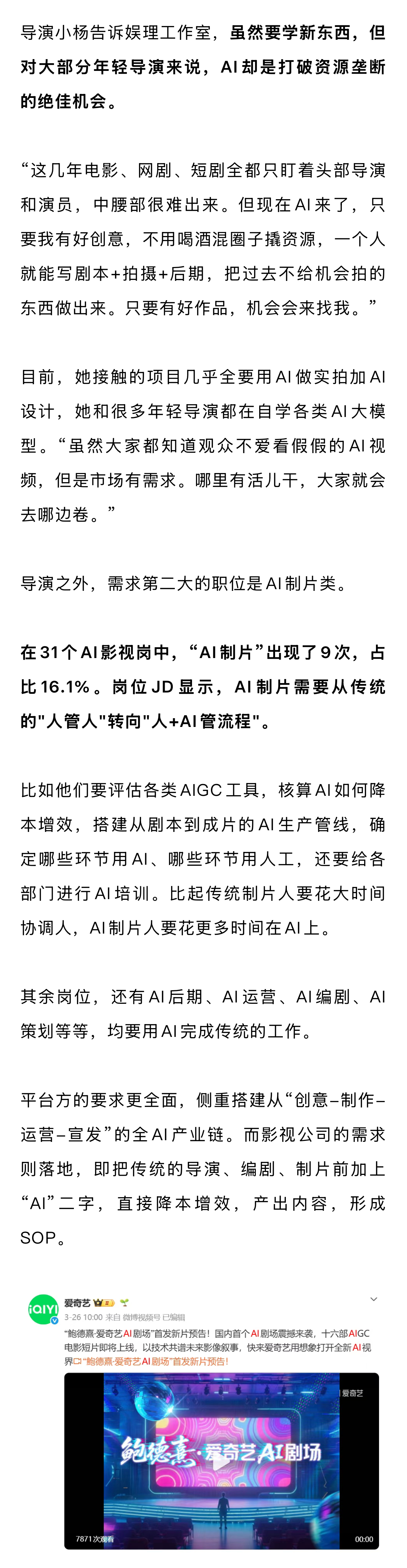 为了帮影视人,甚至是影视专业的学生看清这些焦虑,新浪娱乐工作室对2026年初“AI影视”相关岗位进行了详细分析,并对话多家影视平台、公司以及影视院校,希望帮大家搞清楚,AI时代下,影视行业谁在被抢,谁在出局?不想被AI淘汰,又能做点什么?娱理独家↓