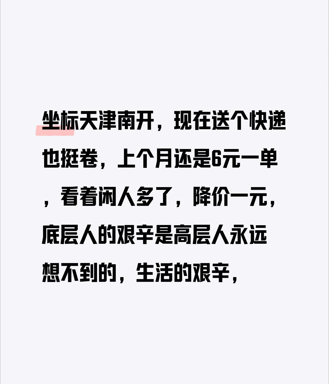 坐标天津南开,现在送个快递也挺卷,上个月还是6元一单,看着闲人多了,降价一元,底