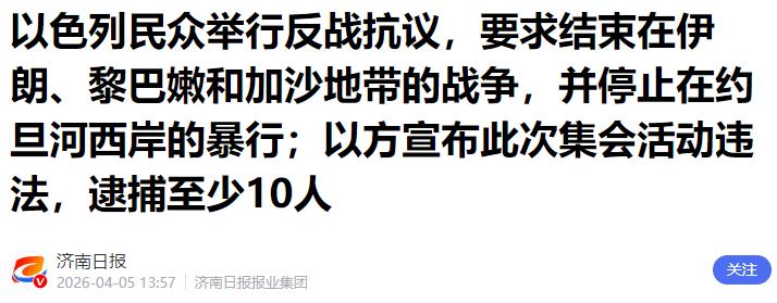 当地时间4月4日,大批以色列老百姓走上特拉维夫街头,参加集会,要求内塔尼亚胡政府结束与伊朗的战争。 从4月3日到4日,伊朗革命卫队联合真主党、胡塞武装,对以色列发动了规模空前的饱和打击,这也是开战以来协同最紧密、力度最大的一轮攻势。 短短48小时内,伊朗方面就发射了上千枚导弹和无人机,从海陆空三个方向,全方位覆盖以色列的核心军事区,甚至连美军在中东的基地也受到了波及。 这些导弹打得又准又密,以色列引以为傲的“铁穹”防御系统根本扛不住,以军自己都承认,在南部城市迪莫纳的袭击中,没能成功拦截来袭导弹,而迪莫纳附近就是以色列从未公开承认、但全世界都知道的内盖夫核研究中心。 导弹带来的恐慌,实实在在落到了每一个以色列老百姓身上。以前,以色列民众总觉得自己的国家军事实力强大,战争只会发生在别人的土地上,自己能安安稳稳过日子。 可这一次,导弹直接打到了特拉维夫、海法等核心城市的中心地带,防空警报每天都在响,不分白天黑夜。 为了躲避袭击,很多老百姓只能住进地下停车场改造的避难所,不敢回家,不敢出门。商铺纷纷关门停业,工作彻底停摆,大家没有了收入,物价却一个劲地上涨,日子过得捉襟见肘。 以色列主要港口的清箱量比正常水平直接腰斩,零售从业者估计本季度销售额只有去年同期的五成,财政部已经把2026年GDP增长预期从5.2%下调到了4.7%,这些实实在在的影响,让老百姓再也坐不住了。 更值得一提的是,就在以色列老百姓举行集会、呼吁停火的当天,内塔尼亚胡还通过社交媒体发布声明,态度强硬地表示,会继续对伊朗实施打击。 他还证实,以军当天空袭了伊朗的石化设施,宣称之前已经摧毁了伊朗约70%的钢铁生产能力,这些钢铁都是伊朗用来制造武器的原材料,他甚至放话,要继续攻击伊朗的钢铁和石化设施,打击伊朗政府的“摇钱树”。 一边是政府铁了心要把战争打下去,一边是老百姓实在受不了战争的折磨,两者的矛盾彻底爆发,集会现场甚至出现了警察驱离民众的混乱场面,至少有10名反战民众被警方逮捕。 这时候再回头看,就更能明白这次集会的意义。以色列军队轰炸和进攻加沙地带已经快两年了,这两年里,加沙地带遭遇了骇人听闻的人道主义灾难。 根据加沙卫生部门的最新数据,从2023年10月新一轮巴以冲突爆发以来,已有超过6.7万巴勒斯坦人丧生,近190万巴勒斯坦人流离失所,差不多占巴勒斯坦总人口的90%,其中一半以上是儿童。 加沙现在正经历联合国所说的“全面饥荒”,干净的饮用水极度稀缺,10升水往往要30谢克尔,约合9美元,很多居民不得不购买受污染的水,煮沸后勉强饮用。 还有很多加沙老百姓被迫多次流离失所,挤在狭小的帐篷里,连基本的温饱都成问题,有的家长只能用野草煮水,骗孩子那是蔬菜汤。 可即便加沙的老百姓过得如此凄惨,即便以色列军队的轰炸毫无章法,造成了大量无辜平民伤亡,这两年里,从来没有见过以色列老百姓走上街头,举行集会要求内塔尼亚胡政府停止对加沙的战争,也没有人站出来呼吁停止杀戮。 那时候,以色列民众对加沙的苦难视而不见,觉得战争和自己无关,甚至默认政府的军事行动。可现在,当伊朗的导弹打到自己家门口,当自己的生活被战争彻底打乱,当自己也要躲在避难所里苟活,他们才真正体会到战争的可怕,才会主动站出来,要求政府结束战争。 其实说到底,以色列老百姓的诉求很简单,就是想过安稳日子,不想再被导弹威胁,不想再躲躲藏藏,不想再承受物价上涨、收入中断的压力。 他们之前的冷漠,不过是因为战争没有波及到自己的利益;现在的反抗,不过是因为自己实在扛不住了。 内塔尼亚胡政府一味坚持对伊朗发动战争,不顾老百姓的死活,不仅让以色列陷入了内外交困的境地,也让地区局势变得更加紧张。 美国已经开始不耐烦,特朗普甚至公开批评以色列“军事冒进、不顾美国利益”,要求内塔尼亚胡立即停止进攻,配合停战谈判,还明确表示“美国不会再为以色列战争买单”。 而以色列国内,老百姓的不满情绪越来越强烈,除了特拉维夫,海法及以色列控制的耶路撒冷等地也举行了反战示威,越来越多的人站出来,反对这场没有尽头的战争。 这场集会,不仅仅是以色列老百姓对战争的反抗,更是对和平的渴望。它也给内塔尼亚胡政府提了个醒,不顾民众意愿、一味穷兵黩武,最终只会失去民心。