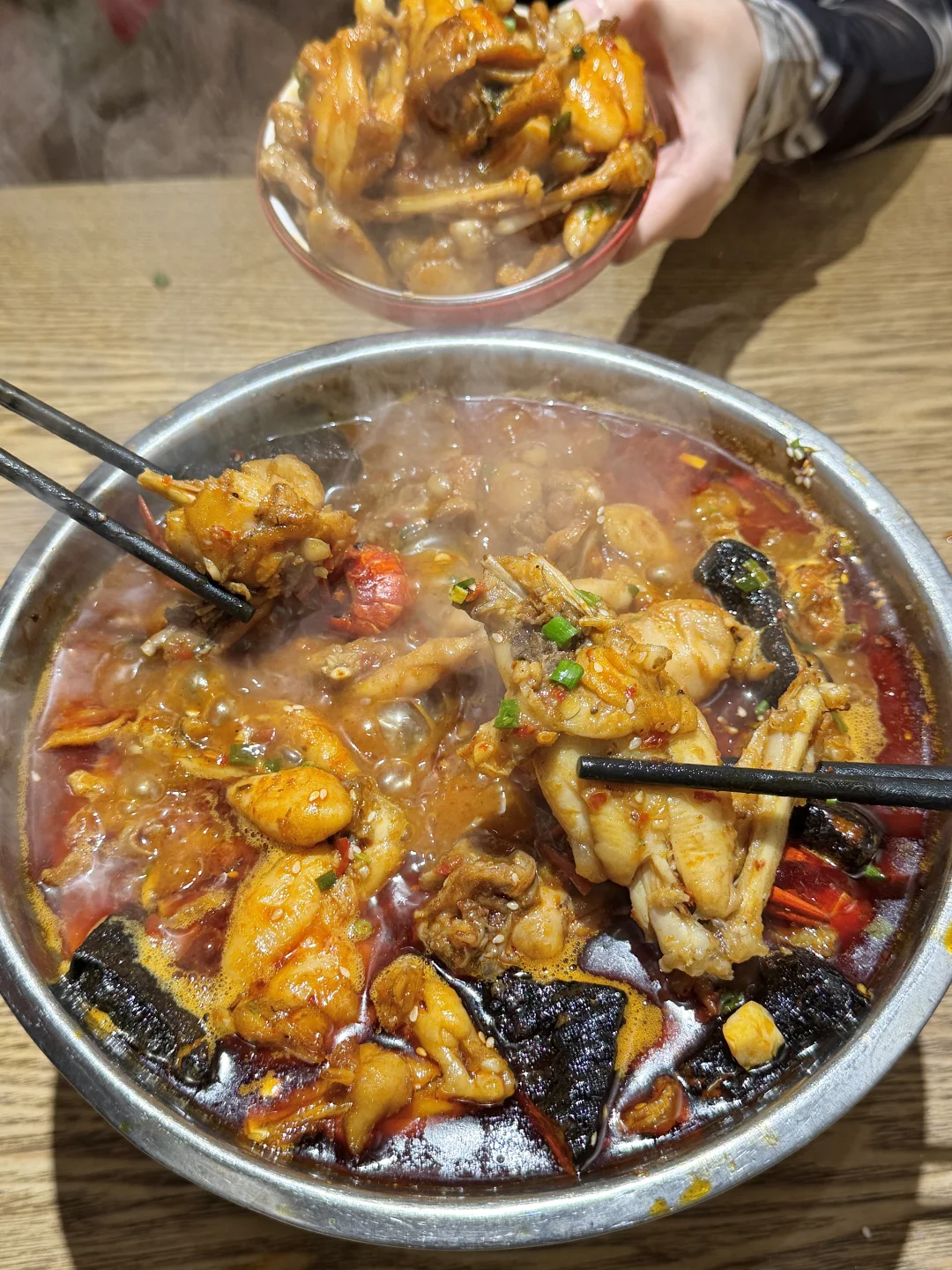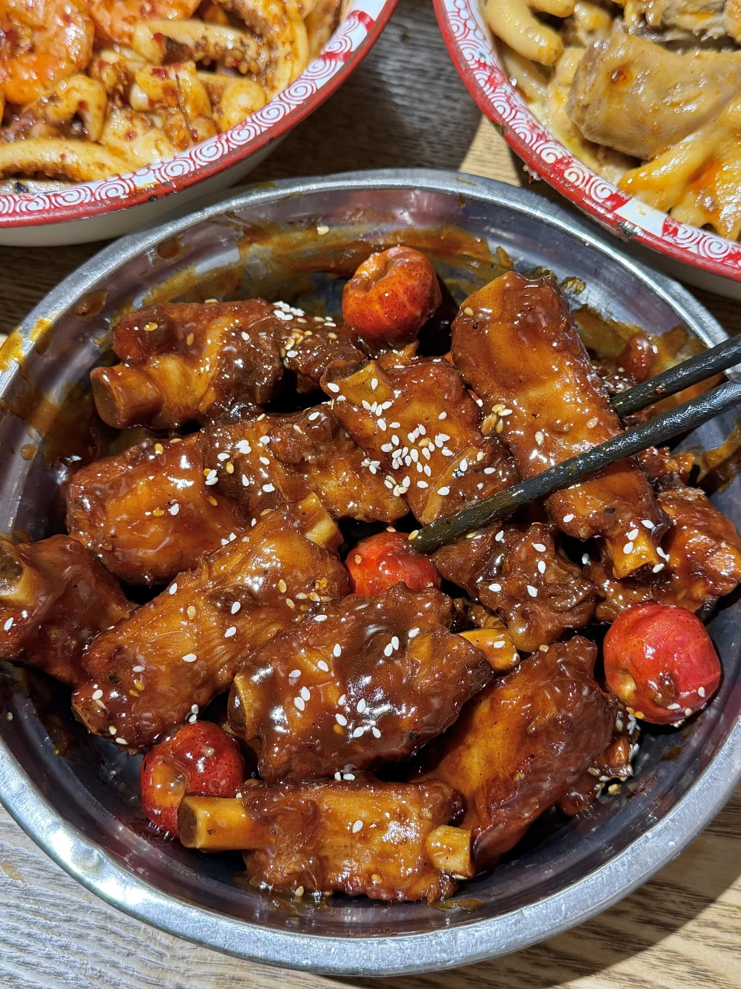老板很爱研发新品,我们还点了满满一桌,人均三四十就能吃饱,推荐臭豆腐牛蛙小龙虾和话梅山楂排骨便宜大碗好吃😭😭份量足!别再去网红店人挤人了,这里不香吗?