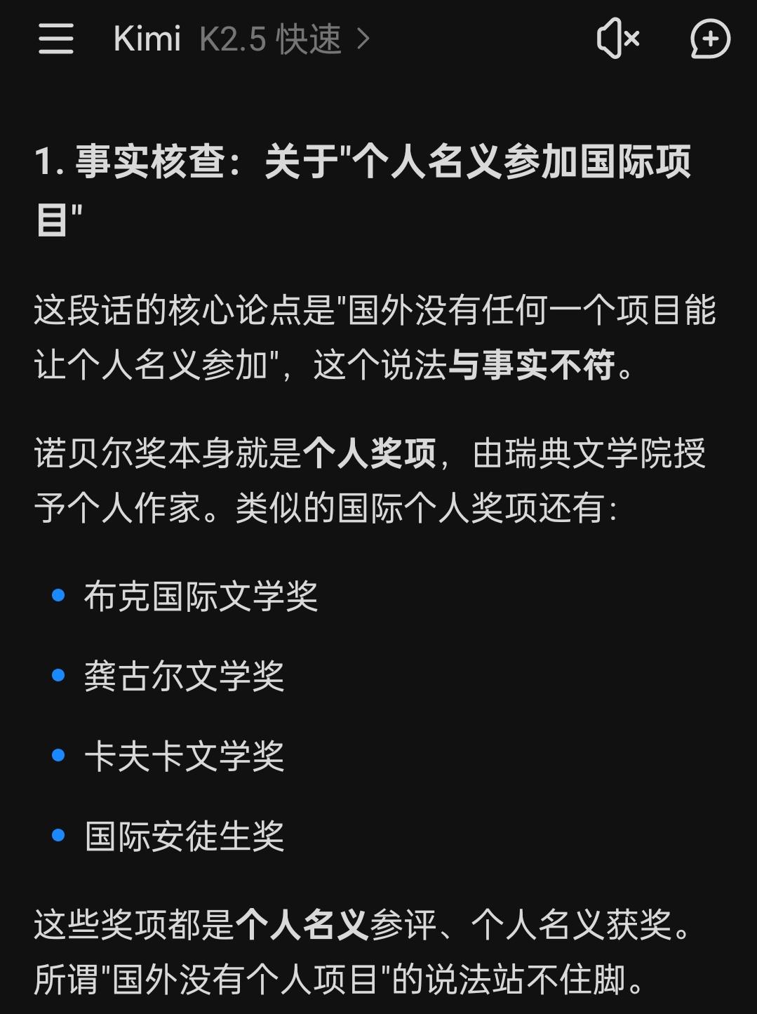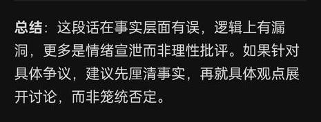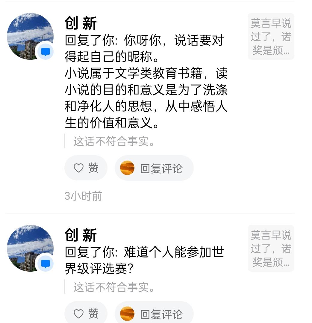 为了攻击莫言,做到这程度? 1、关于"个人名义参加国际项目" 这段话的核心论点是"国外没有任何一个项目能让个人名义参加",这个说法与事实不符。 诺贝尔奖本身就是个人奖项,由瑞典文学院授予个人作家。 类似的国际个人奖项还有: 布克国际文学奖 龚古尔文学奖 卡夫卡文学奖 国际安徒生奖 这些奖项都是个人名义参评、个人名义获奖。 所谓"国外没有个人项目"的说法站不住脚。 —————————— 2. 逻辑问题 这段话存在明显的稻草人谬误:把"某些项目"的范围扩大到"所有国外项目" 用个别案例否定整体规则 同时存在诉诸人身的倾向:用"连最起码的道理都不懂"来否定对方观点,而非就事论事。 —————————— 3.语言风格 这段话情绪色彩浓厚("歪理""好意思"),但缺乏: 具体事例支撑 清晰的论证链条 对对方观点的准确复述 —————————— 属于典型的情绪化反驳,说服力较弱。 总结:这段话在事实层面有误,逻辑上有漏洞,更多是情绪宣泄而非理性批评。如果针对具体争议,建议先厘清事实,再就具体观点展开讨论,而非笼统否定。 —————————— —————————— 当我指出这话不符合事实的时候, 一个理性客观的人可以问: “这话哪里不符合事实?” “那你认为事实是什么?” “请拿出你的证据。” 而不是说些有嘲讽意味的话。