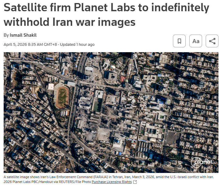 【美伊以冲突 “应美政府要求”,美卫星测控公司无限期暂停发布卫星军事 影像】总部位于美国旧金山的一家遥感卫星数据公司——星球实验室(Planet Labs)4月4日宣布,应美国政府要求,将无限期暂停发布伊朗及中东冲突地区的卫星影像。