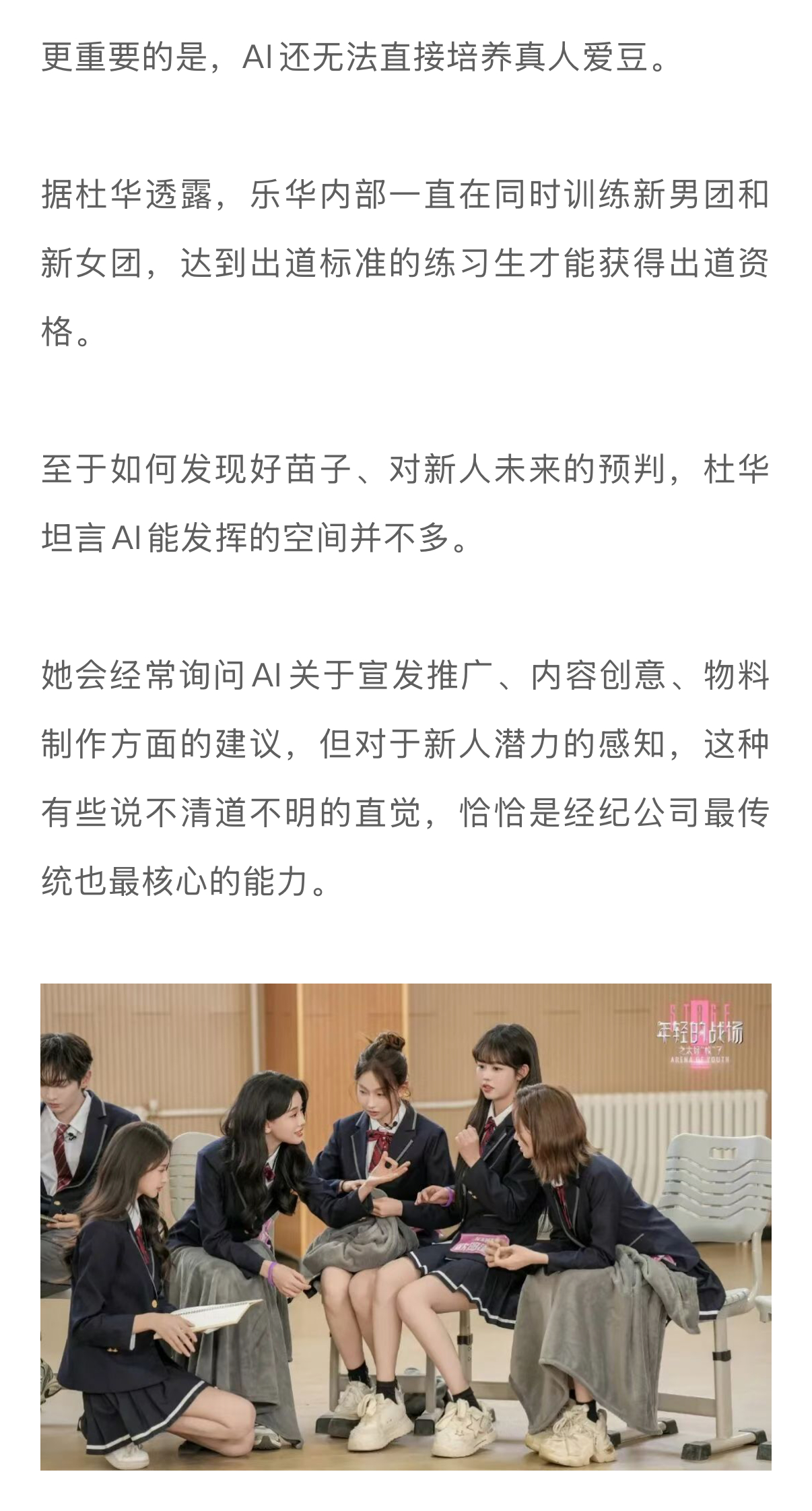 杜华透露乐华内部一直在同时训练新男团和新女团,达到出道标准的训练生才能获得出道资格。至于如何发现好苗子、对新人未来的预判,她坦言AI能发挥的空间并不多。目前,HeyDream的六位成员已在乐华秘密训练四年有余,公司在前期投入很多成本,只是借助AI调整了内容生产的效率与门槛,她直接否认了“零成本打造”的说法。