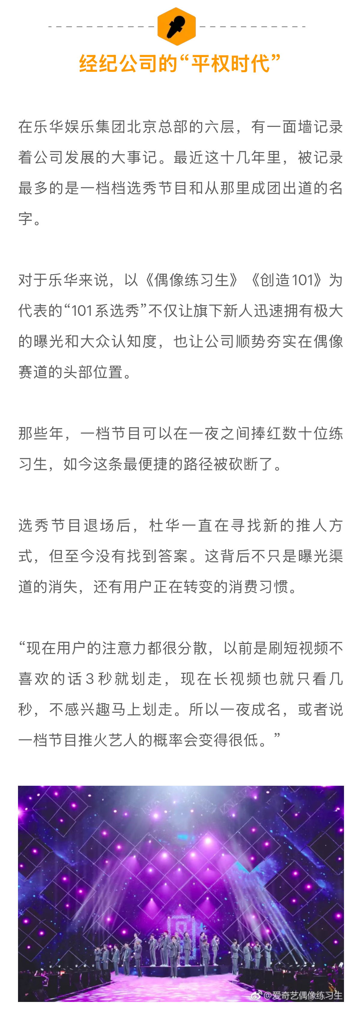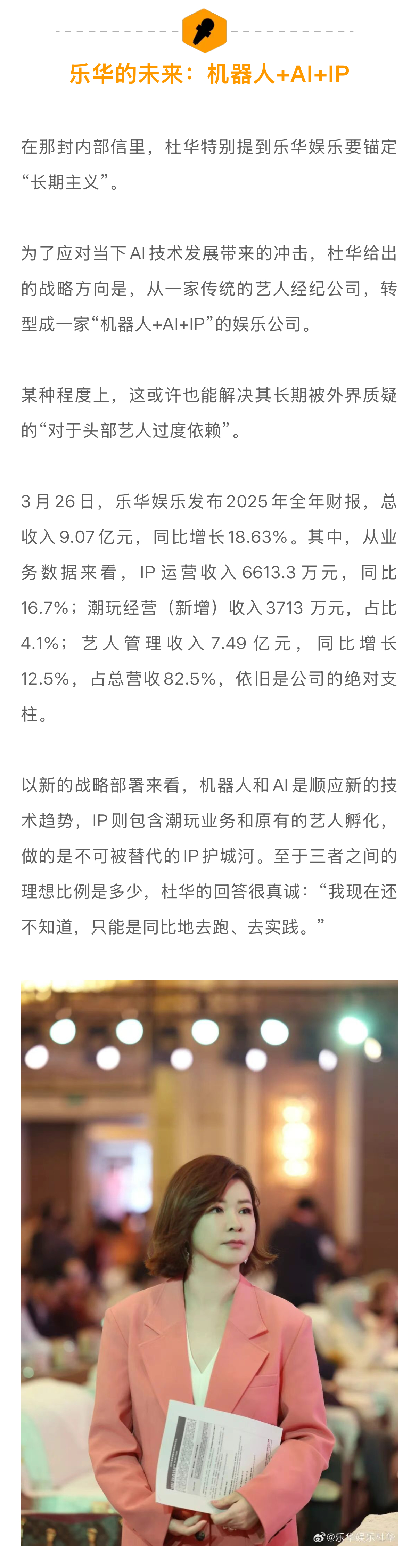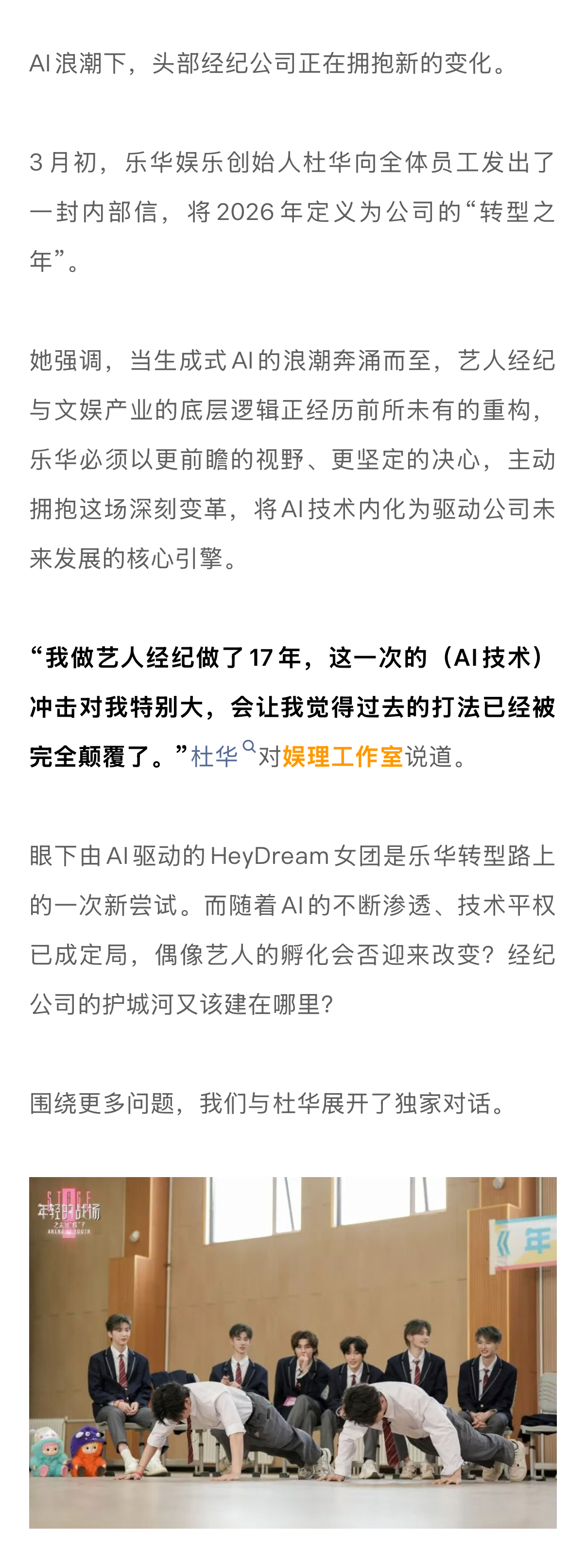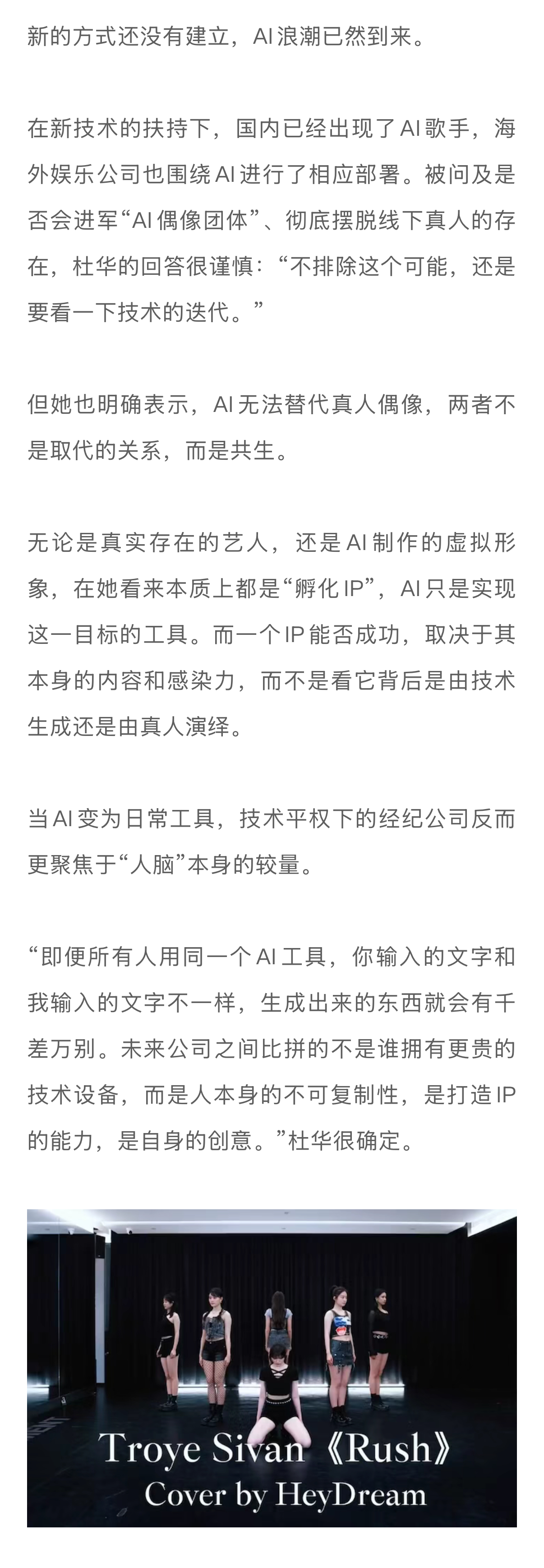 在杜华看来,AI的发展确实对整个文娱行业是巨大冲击,但不会因此感到恐慌,并直言AI背后的算力成本不是经纪公司能烧得起的,未来各家企业都是专攻自己擅长的领域。娱理独家↓