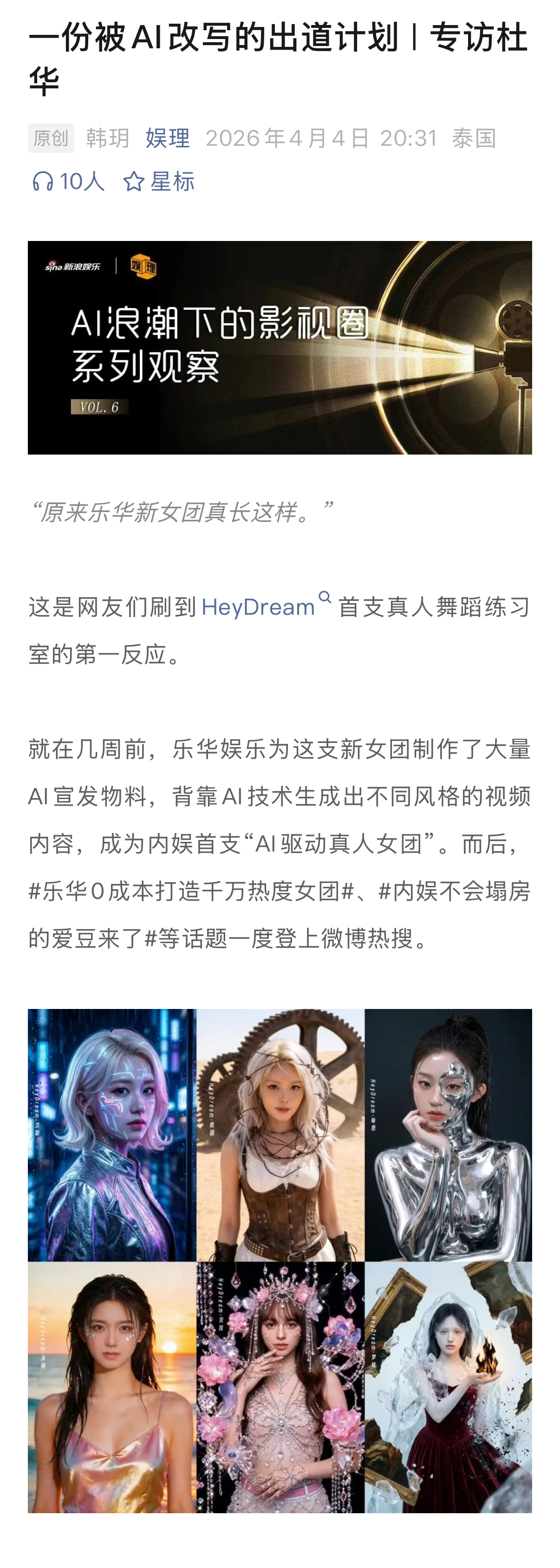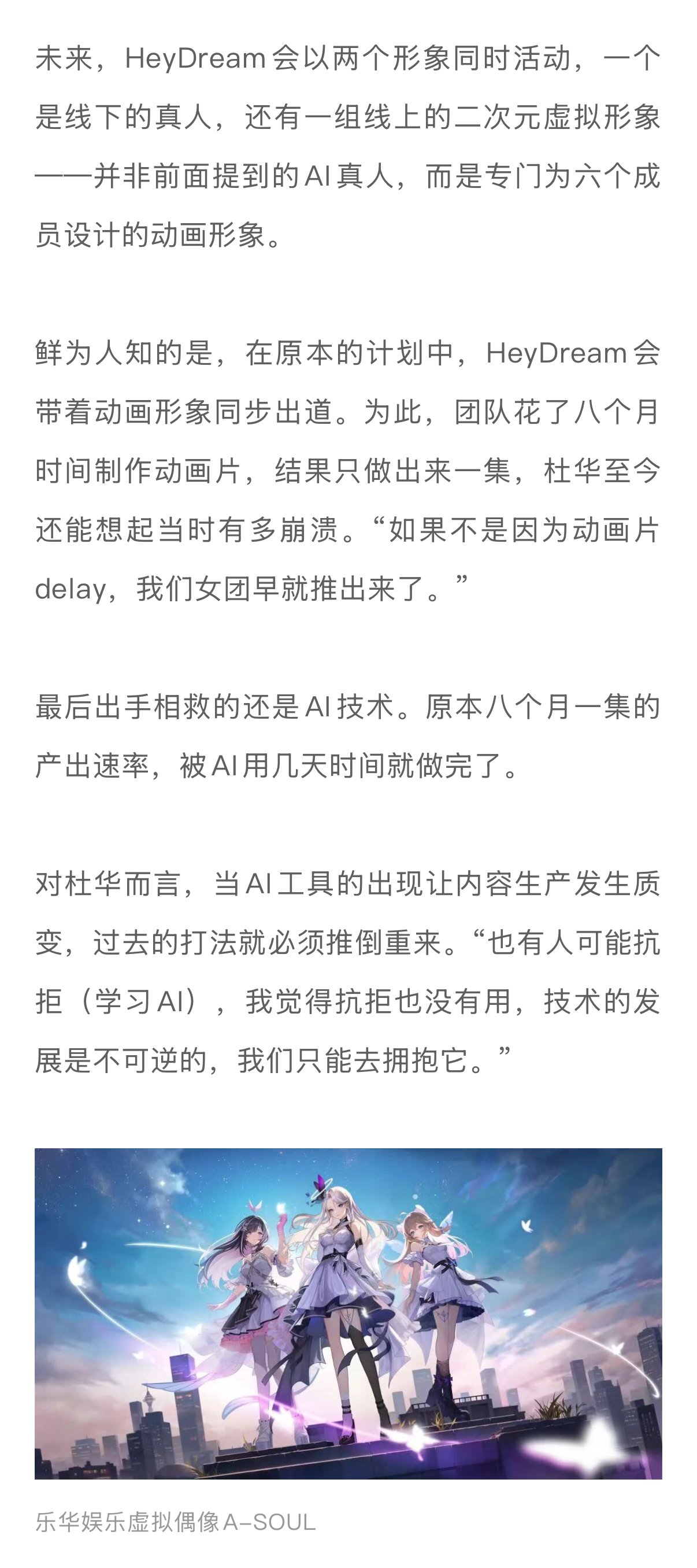 杜华谈真人偶像不会被AI取代杜华说AI把过去的打法都颠覆了 和新浪娱乐独家对话时,杜华透露女团HeyDream原本计划同步推出动画形象,团队花了八个月时间制作动画却只做出来了一集,最后是AI用几天时间就做完了原本八个月一集的产出。