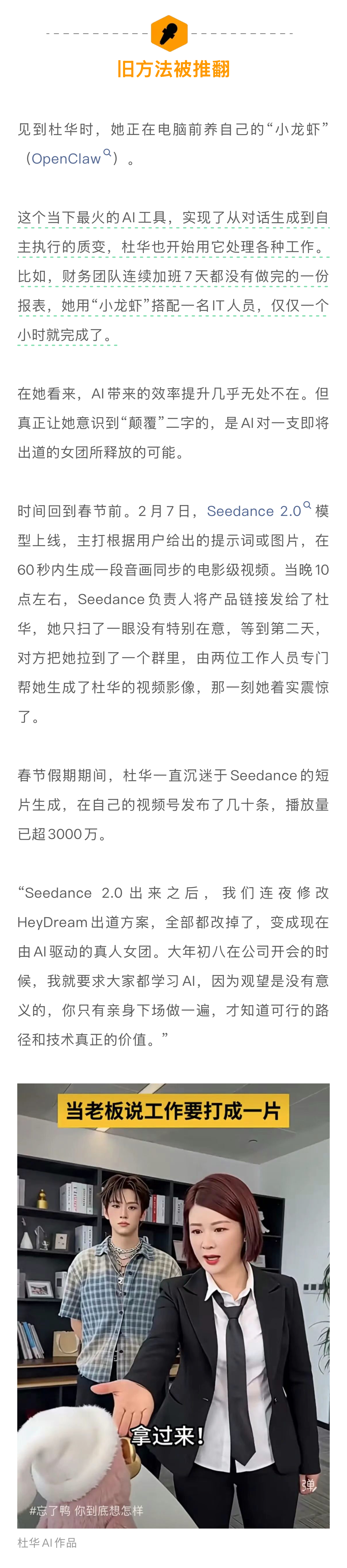 杜华大年初八在公司开会时就要求大家都学习AI,因为观望是没有意义的,只有亲身下场做一遍,才知道可行的路径和技术真正的价值。杜华强调,当AI工具的出现让内容生产发生质变,过去的打法就必须推倒重来。