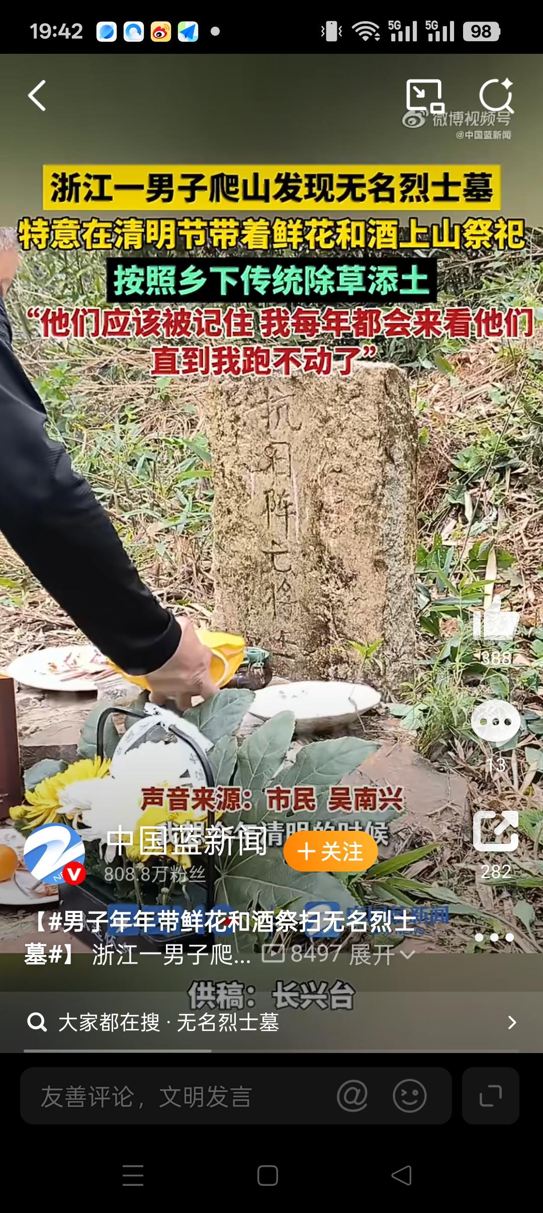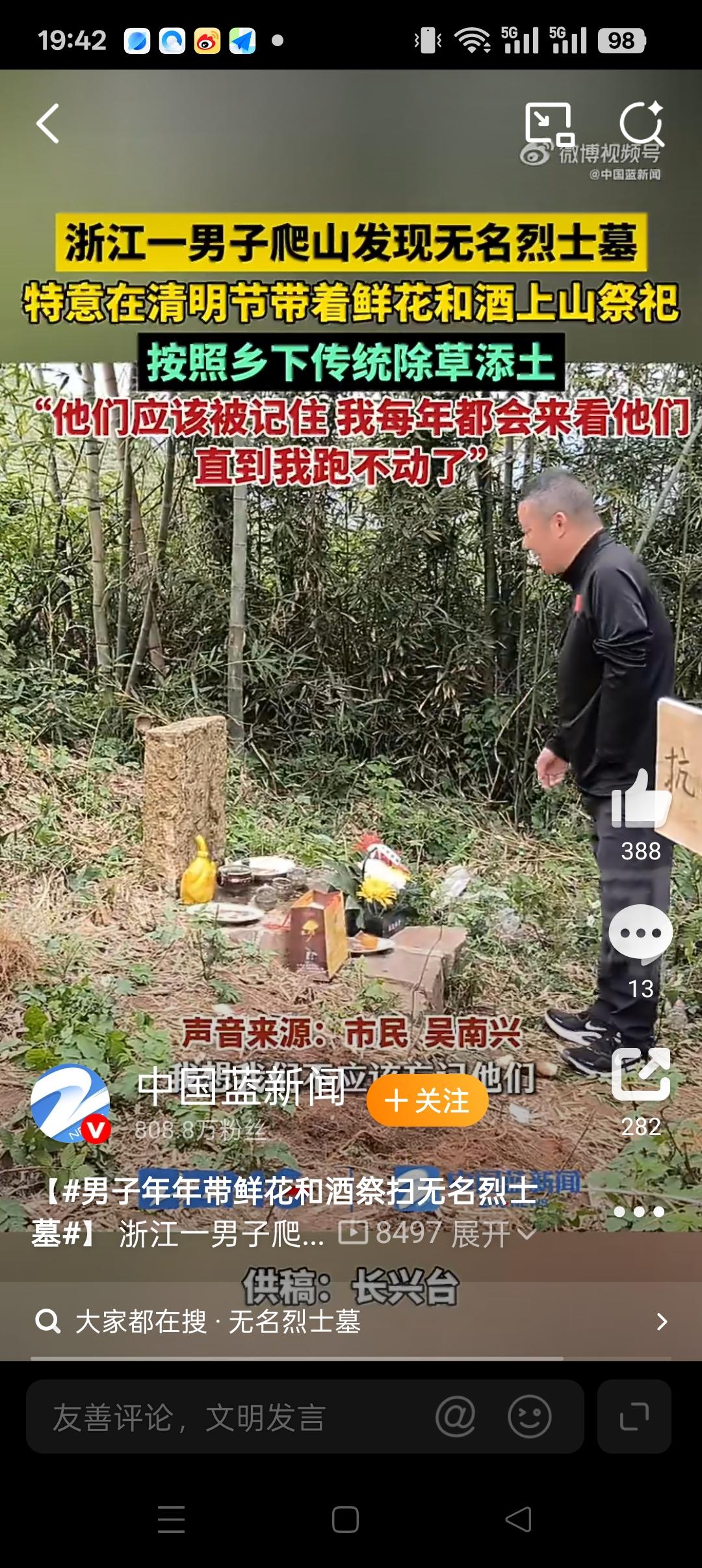 浙江金华男子年年携酒祭奠无名烈士墓,数十年坚守,让无名英雄不再孤单! 清明时节,细雨纷飞,哀思弥漫。在浙江金华一处幽静的山野中,一座既无姓名、也无碑文的烈士墓前,一位男子的身影,数十年如一日地出现。他每年都会提着一壶老酒,准时赶来,除草、添土、敬酒、默哀,以最质朴的方式,陪伴着长眠于此的无名英雄,令无数网友为之动容。 这座无名烈士墓背后,藏着一段鲜为人知的家国往事。烈士为了民族解放、家国安宁,血洒疆场,却连姓名都没留下,孤独地长眠于山林之间。多年前,这位金华的普通男子偶然发现了这座墓,内心满是感动,当下便下定决心,要替后人守护这份忠魂。从此,年年祭扫成了他坚定不移的约定。 对他来说,带一壶酒,是对英雄最深切的慰藉。他常说,英雄也是有着七情六欲的人,也曾有牵挂、有念想。如今山河无恙,百姓安康,该让他们尝尝这太平盛世的酒,知晓我们从未将他们忘却。没有奢华的祭品,没有盛大的仪式,他蹲在墓前,仔细清理杂草,轻轻擦拭墓石,斟满一杯酒洒在墓前,然后静静地伫立,陪英雄待上片刻,所有的敬意,都蕴含在这无声的举动之中。 数十载风雨无阻,他从黑发逐渐生出白发,却从未间断过这份坚守。在许多人追逐名利、淡忘历史的当下,他以平凡人的坚守,诠释了何为家国情怀,何为对英雄的敬畏。没有媒体报道,没有刻意宣扬,他只是默默地做着这件事,只愿无名英雄不再孤单,忠骨能够安息。 网友们看后纷纷泪目,留言道:无名烈士守家国,平凡男子守忠魂,这才是最动人心弦的中国人的浪漫!真正的传承,并非喊口号,而是刻在心底的铭记,是日复一日的践行。 一抔黄土掩埋忠骨,一壶清酒敬奉英雄。这位金华男子的坚守,看似平凡,实则重如千钧。他让我们明白,英雄从未被遗忘,每一份牺牲都值得铭记,这份跨越岁月的敬意,终将成为民族精神中最温暖的光芒。 后人为烈士扫墓
