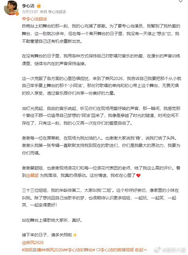 李心洁时隔20年再回舞台捧着手机读完李心洁的长文鼻尖一下子发酸✨时隔二十年重新站上乘风舞台,她眼里对唱歌的热忱还是和当年一模一样。为勇敢追梦的阿洁打call,我们会一直静静听你唱下去🎤乘风2026
