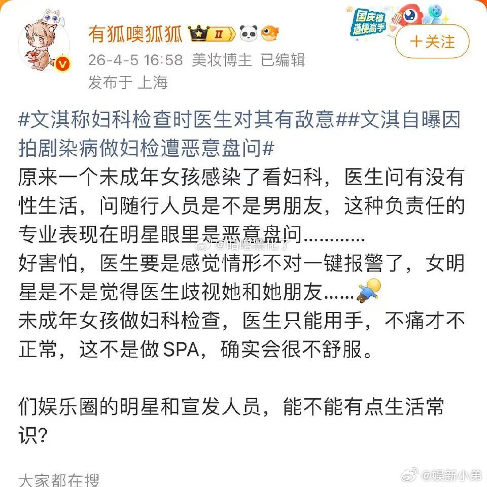 文淇的这个rs好像翻车了?有新电影需要热度?文淇称妇科检查时医生对其有敌意