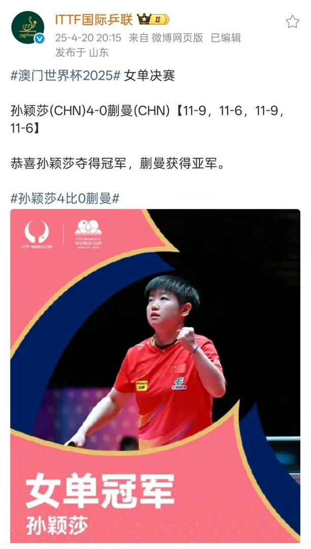 孙颖莎成为女乒历史上第一个世界杯三连冠!!