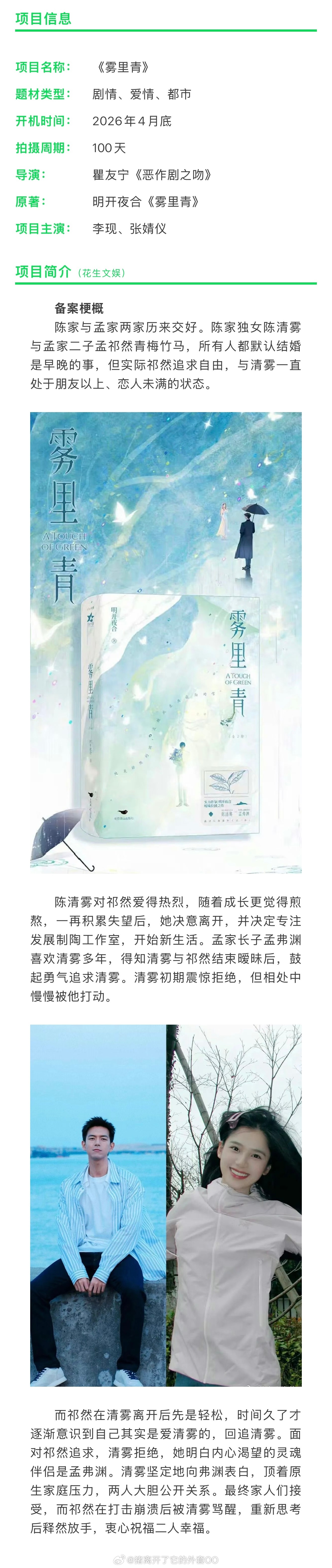 🍉现代都市爱情剧《雾里青》主演:李现、张婧仪导演:瞿友宁预计四月底开机!!