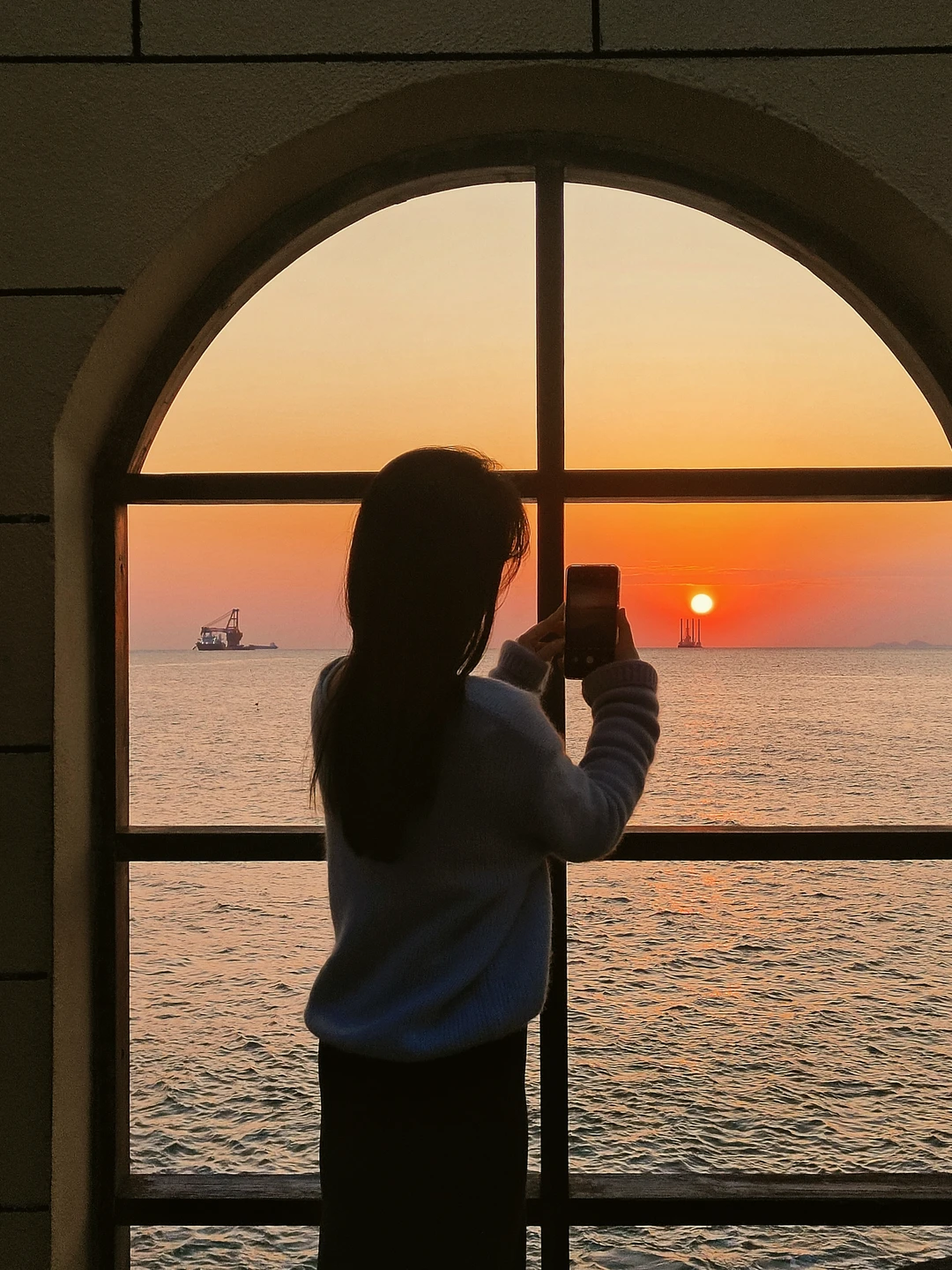 不起眼的一个放生台角落,远远看着夕阳缓缓落下,染红了天空,映照波光粼粼的海面