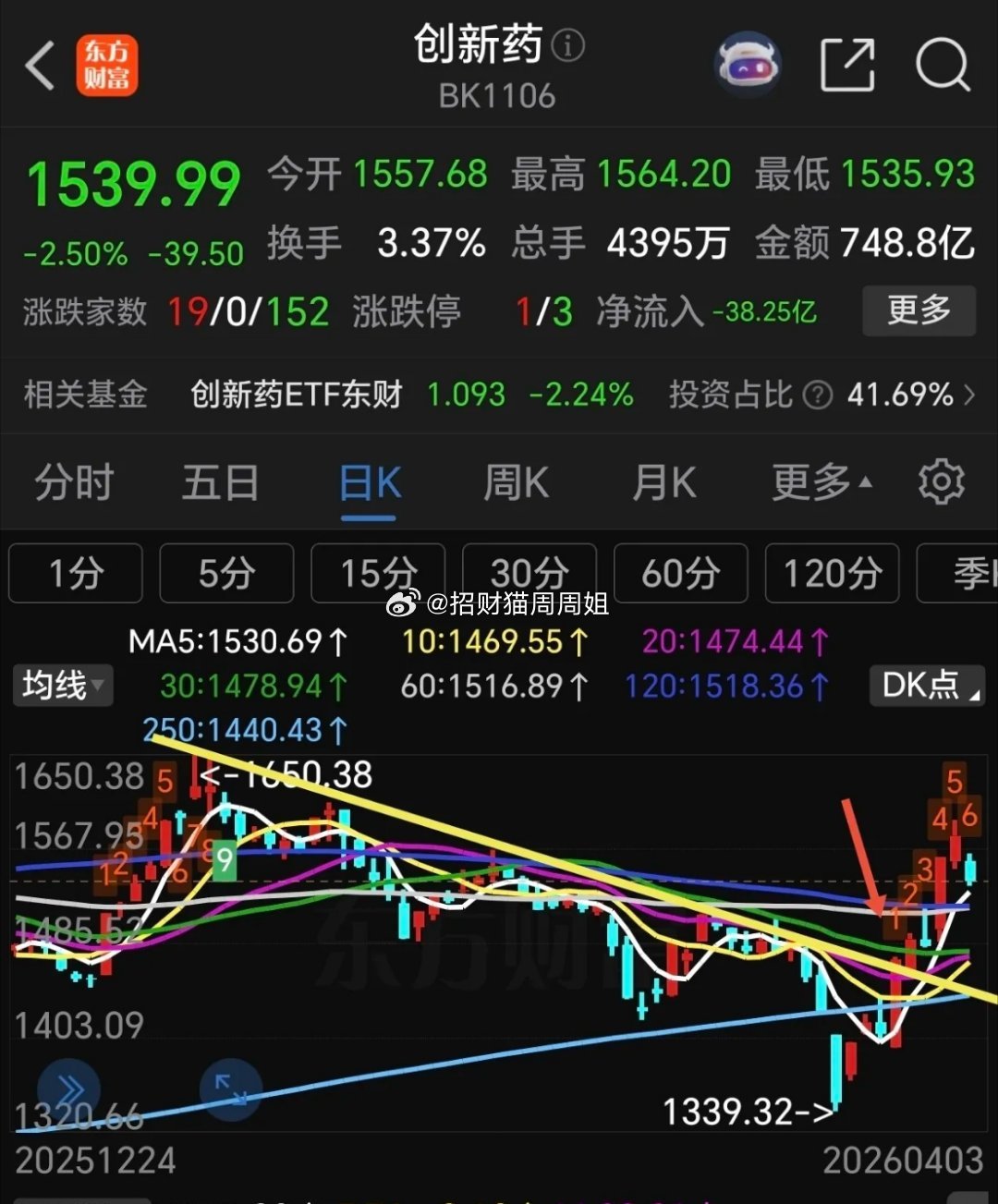 回调到哪里,第一目标是回踩五日线支撑,再就是回踩原来的下降趋势线支撑位,正好与60日线重合。距离5日线支撑大约有5%下跌空间。A股创新药(东财指标)看下方60-120日线支撑力度,空间不大,假如港股创新药回调幅度比较大,A股一般会跟随,就看主力态度了。假如上述重要支撑位依次跌破,那么回调深度与回调时间要加大。能否趁回调介入,密切关注下周初走势,不可盲目大幅度介入。