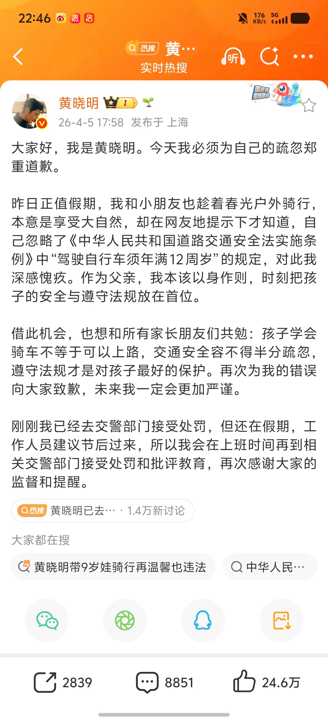 在我老家那边,每天上学放学的路上,别说小孩骑自行车了,还有骑电动车的,相当危险,可现实就是这种情况太多,确实管不过来,但咱也不能因为普遍就忽视安全,我们能做的,就是看好自己家孩子,守好规矩。讲真的,不满12岁小孩不能骑自行车上路是硬性规定,黄晓明带9岁儿子骑车,他道歉认罚没毛病,毕竟是明星,要起好带头作用黄晓明已去交警部门接受处罚