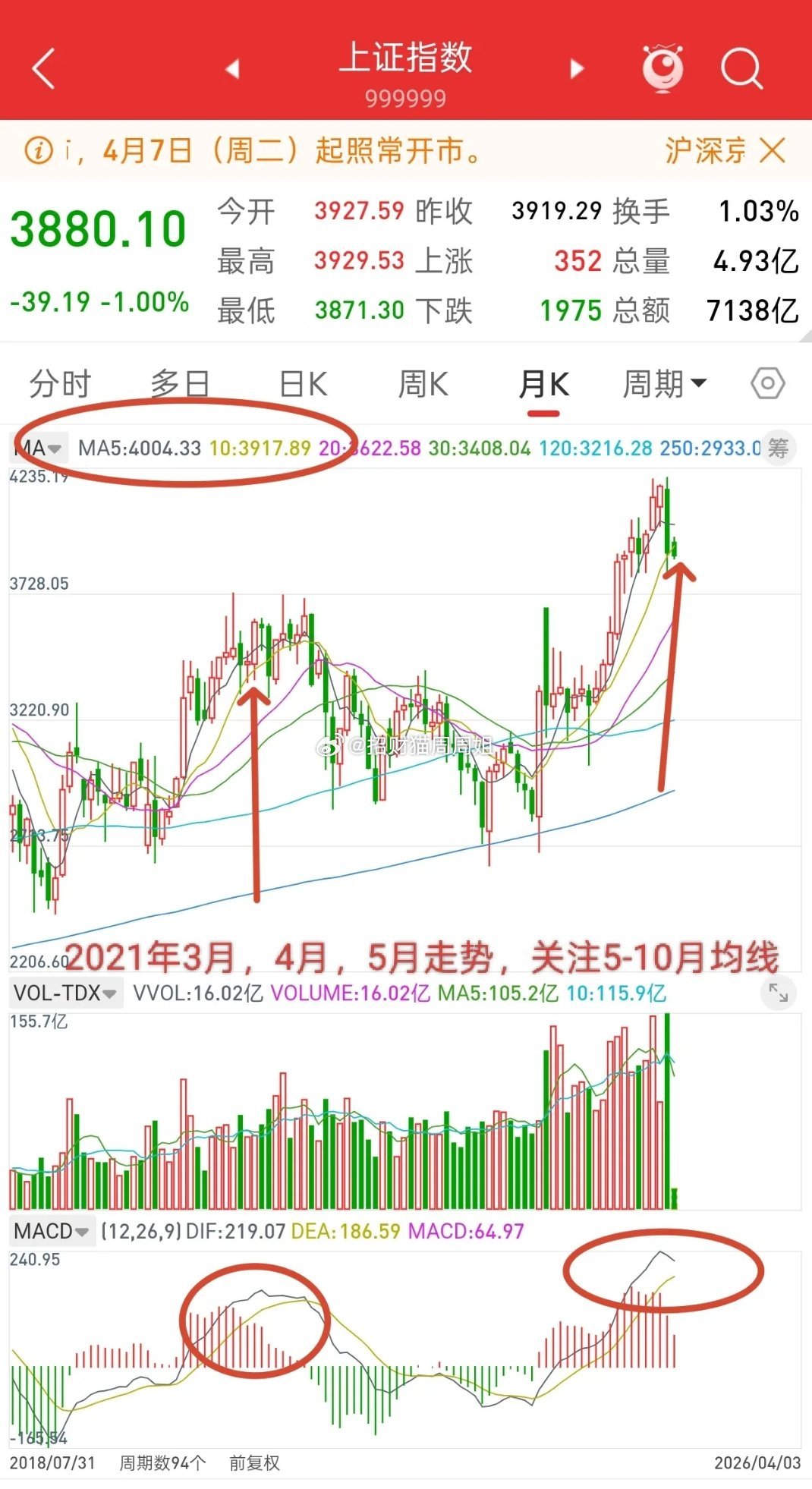 不说别的,目前走势,3月份大跌,日线从4197一路下跌至3794,跌幅403点,再看看第一波反弹3497-3955,以及再看月线,五月均线是4004,十月均线是3917。