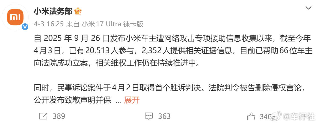 【首例胜诉!小米法务部:超2万人参与车主维权专项】4月3日,小米法务部发文称,自 2025 年 9 月 26 日发布小米车主遭网络攻击专项援助信息收集以来,截至今年4月3日,已有20,513人参与,2,352人提供相关证据信息,目前已帮助66位车主向法院成功立案,相关维权工作仍在持续推进中。同时,官方还透露这些民事诉讼案件在4月2日取得了首个胜诉判决。法院判令被告删除侵权言论,公开发布致歉声明并保留不少于10日,赔偿车主3000元并承担本案诉讼费用。新能源汽车车评观察