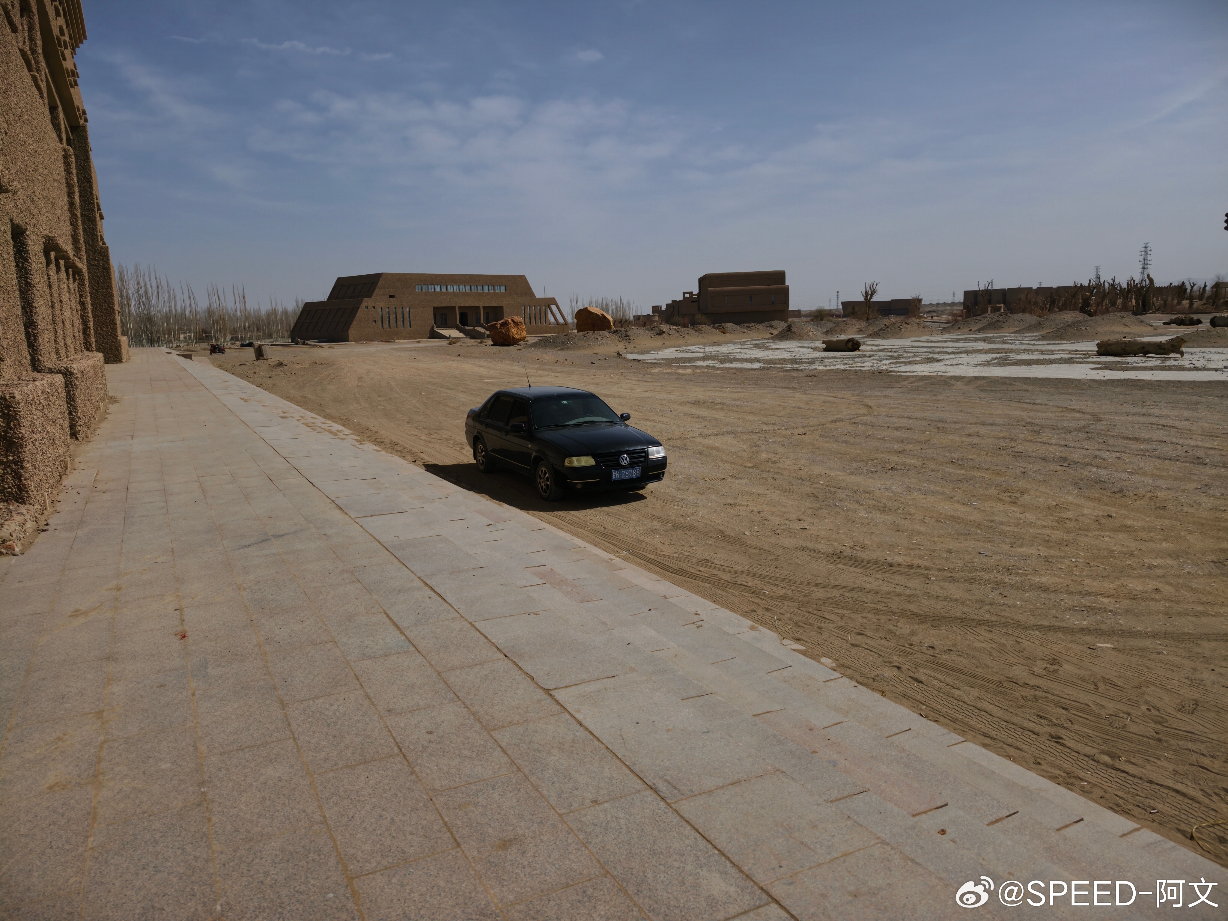 一辆在沙漠中的桑塔纳,多少有点落寞的样子。汽场全开