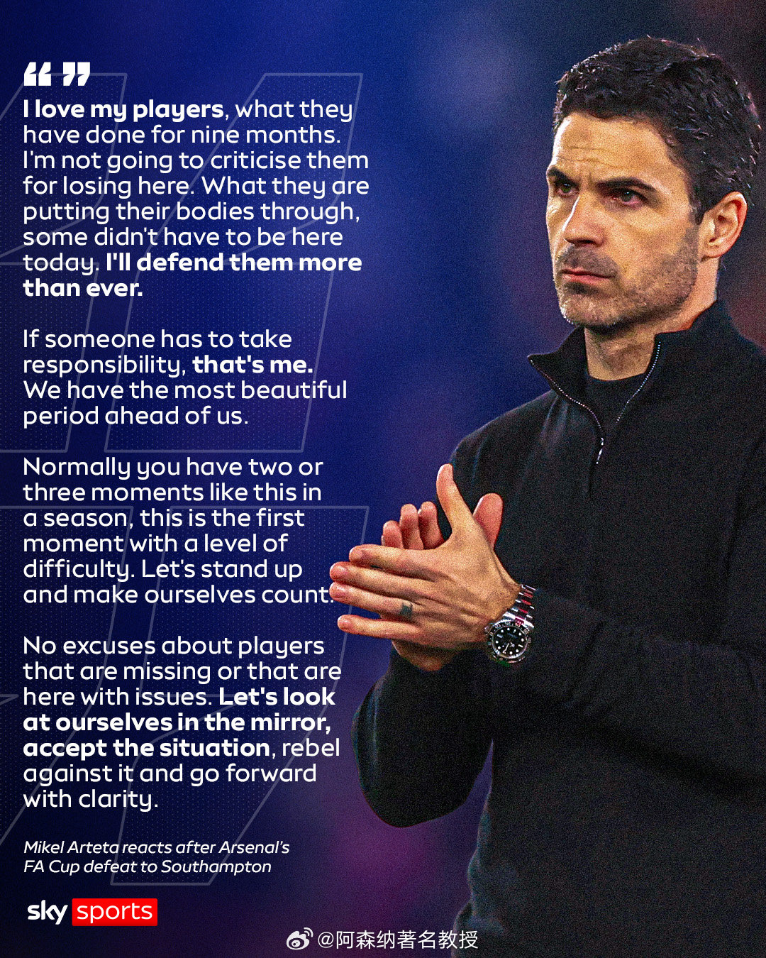 在阿森纳队于足总杯中不敌南安普顿队遭遇淘汰后,阿尔特塔并未直接指责麾下球员,但要