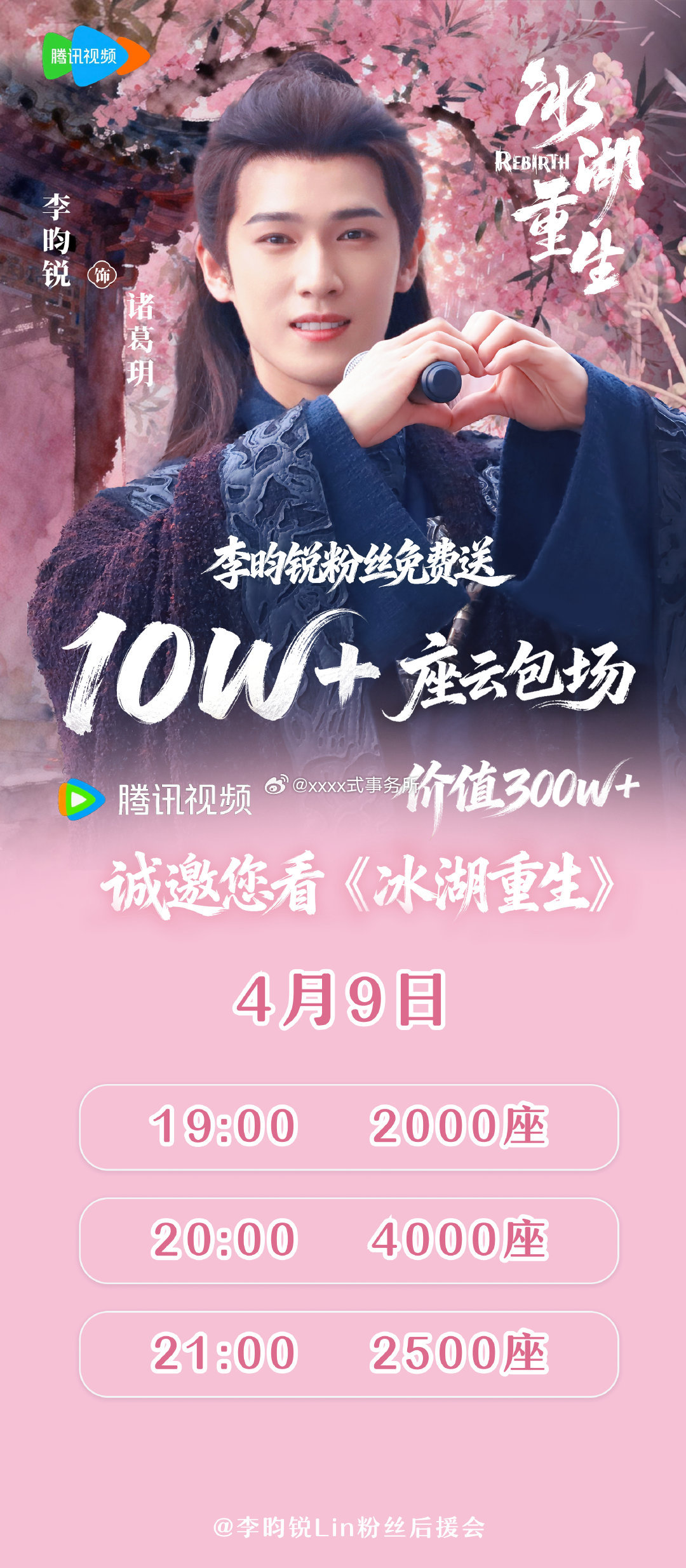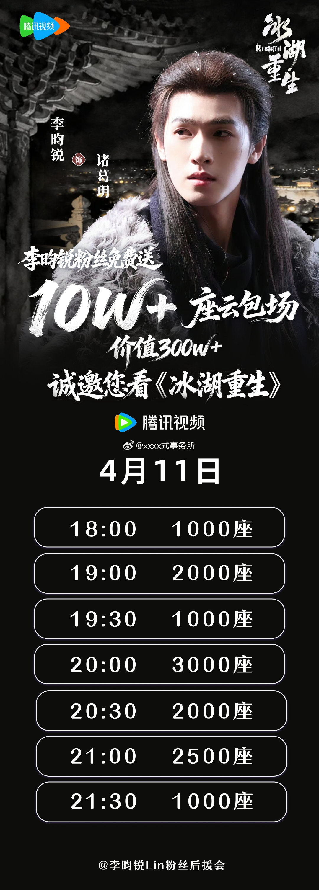 李昀锐家4月8号中午12点开始投放云包场,腾讯爱奇艺都🈶 ,累计10w座云包场