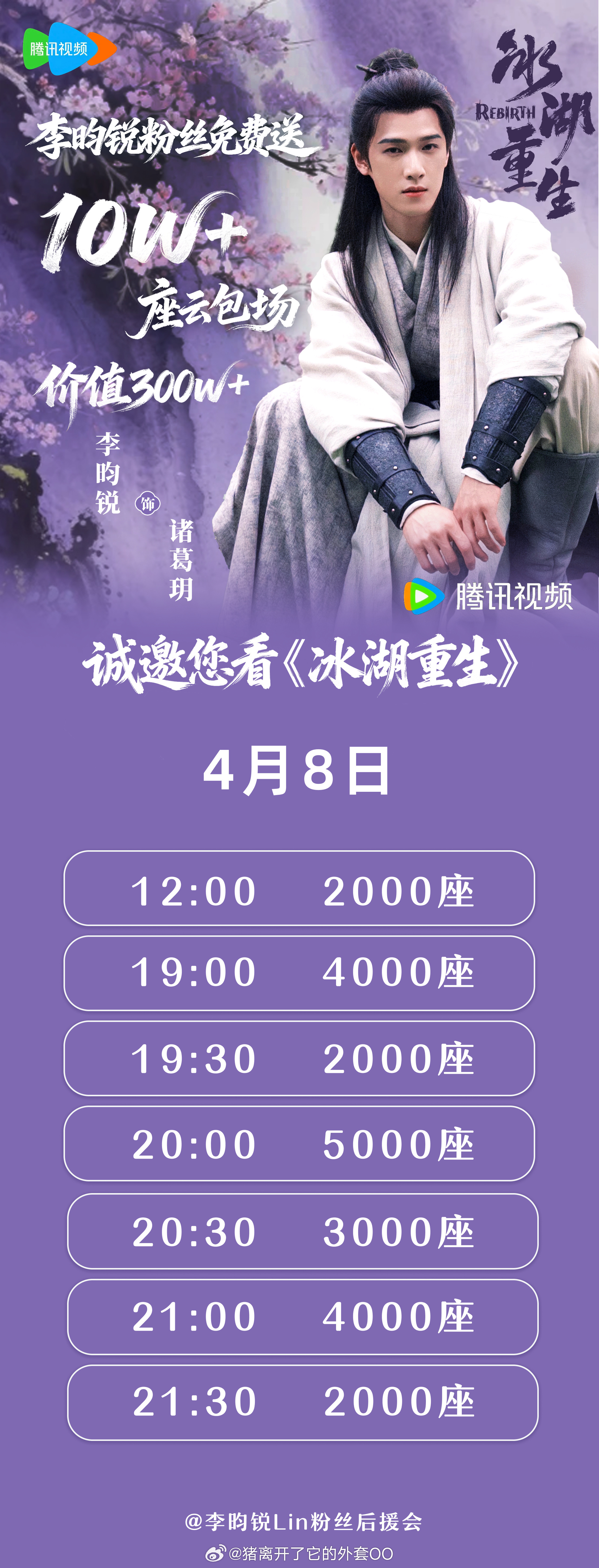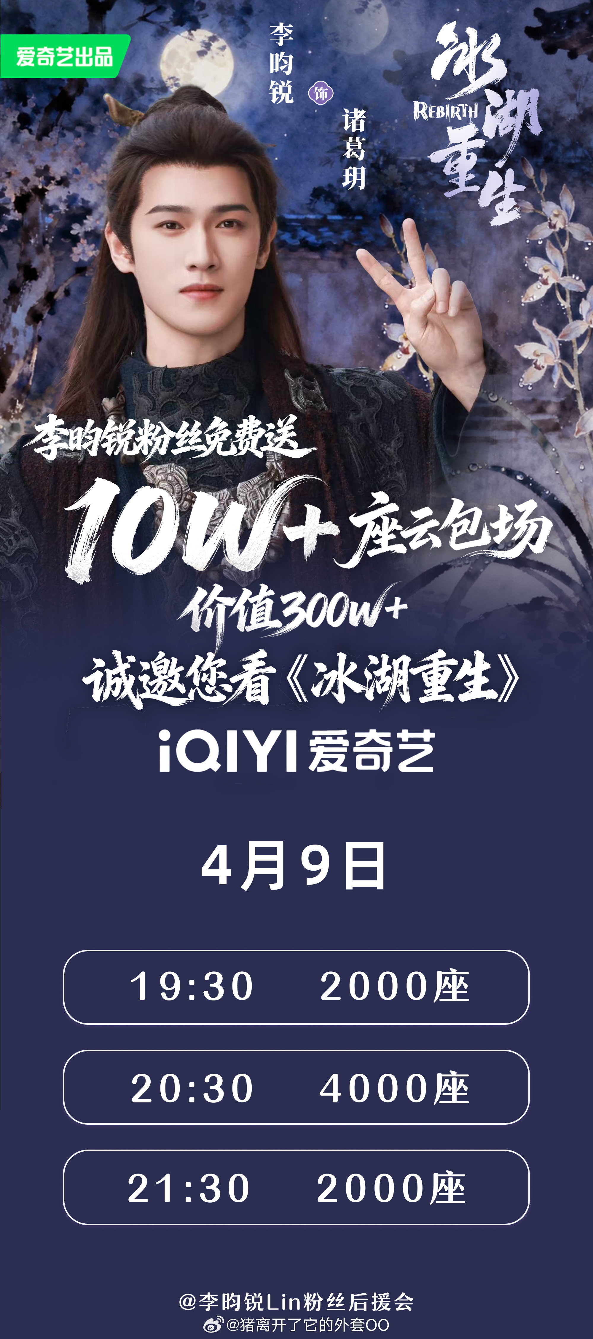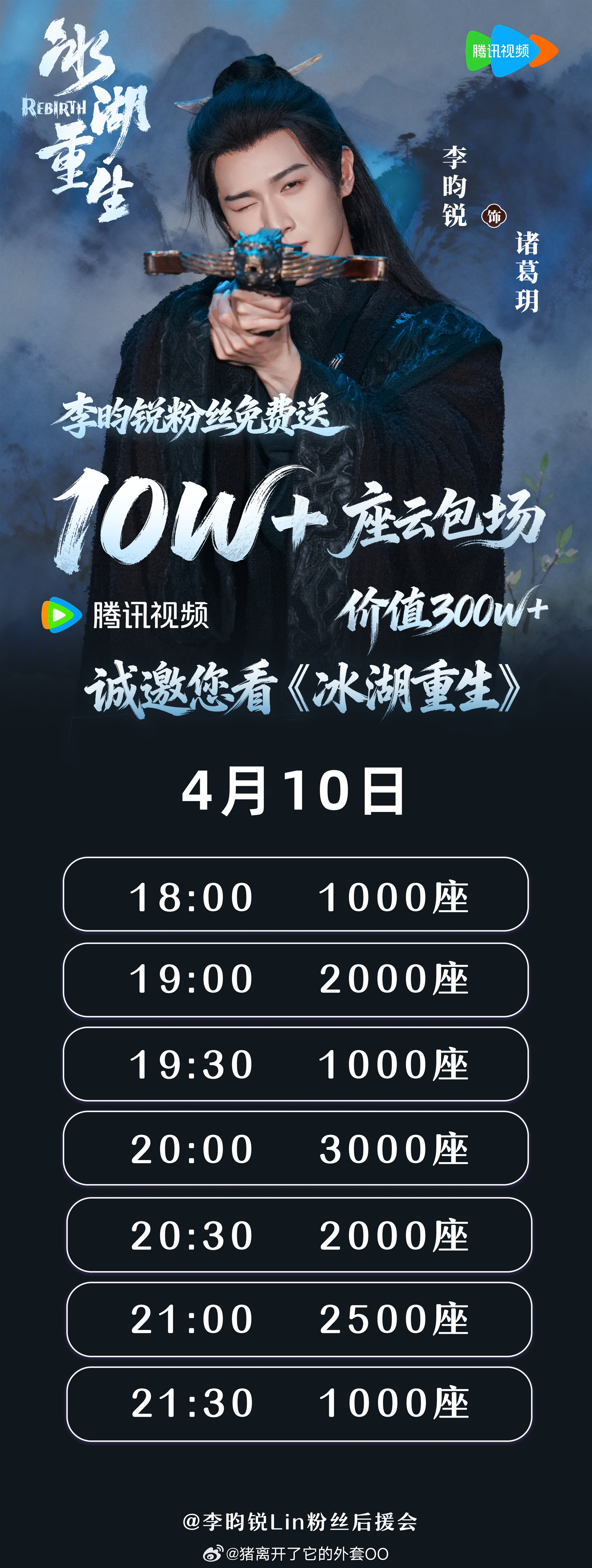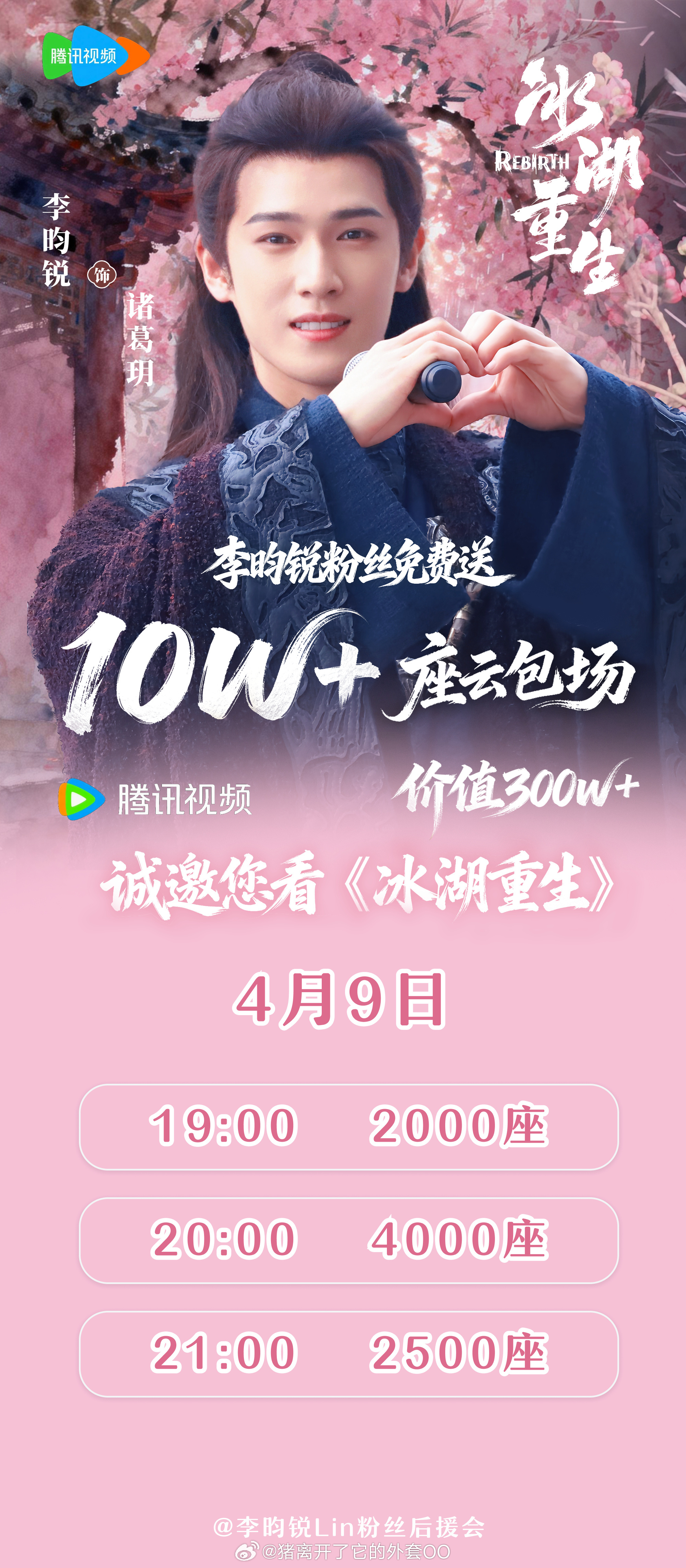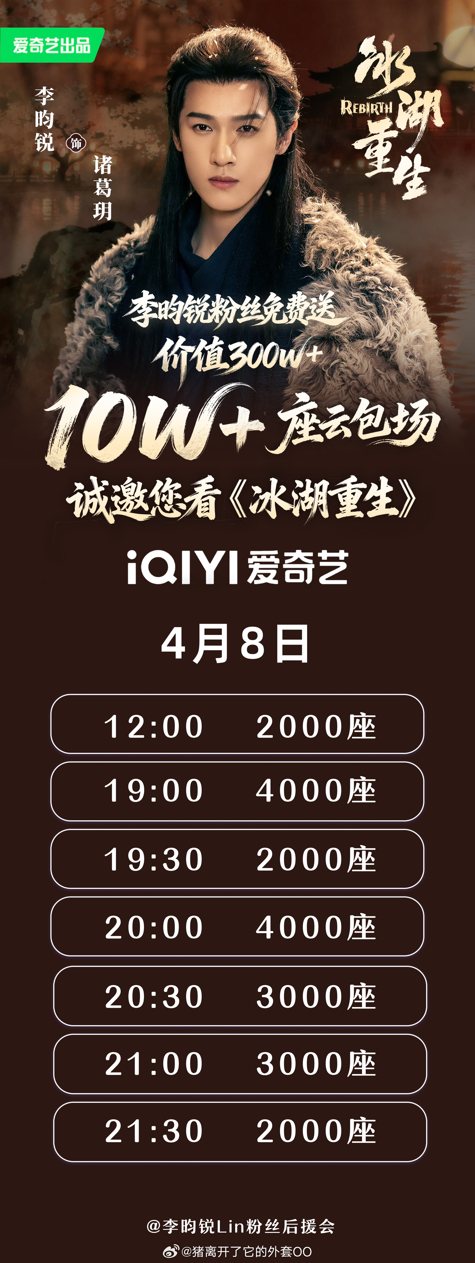 📣📣李昀锐家4月8号中午12点开始投放《冰湖重生》云包场,腾讯爱奇艺都有,累计10w座云包场,感兴趣的快关注起来!!